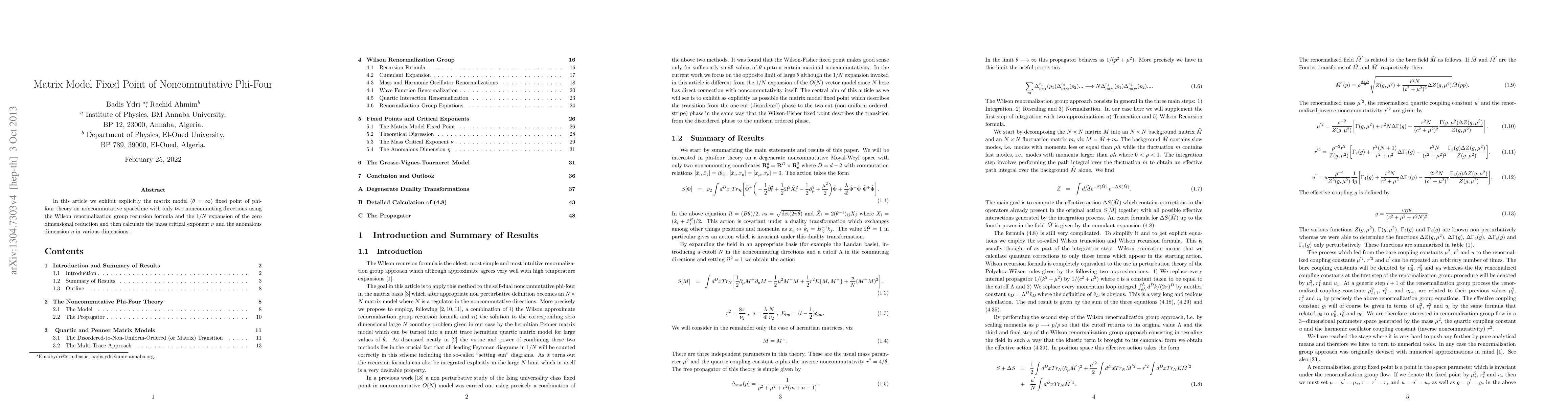 This paper identifies the matrix model fixed point for noncommutative phi-four theory in two noncommuting directions, employing the Wilson renormalization group and 1/N expansion. It calculates the mass critical exponent $\nu$ and the anomalous dimension $\eta$ in different dimensions.