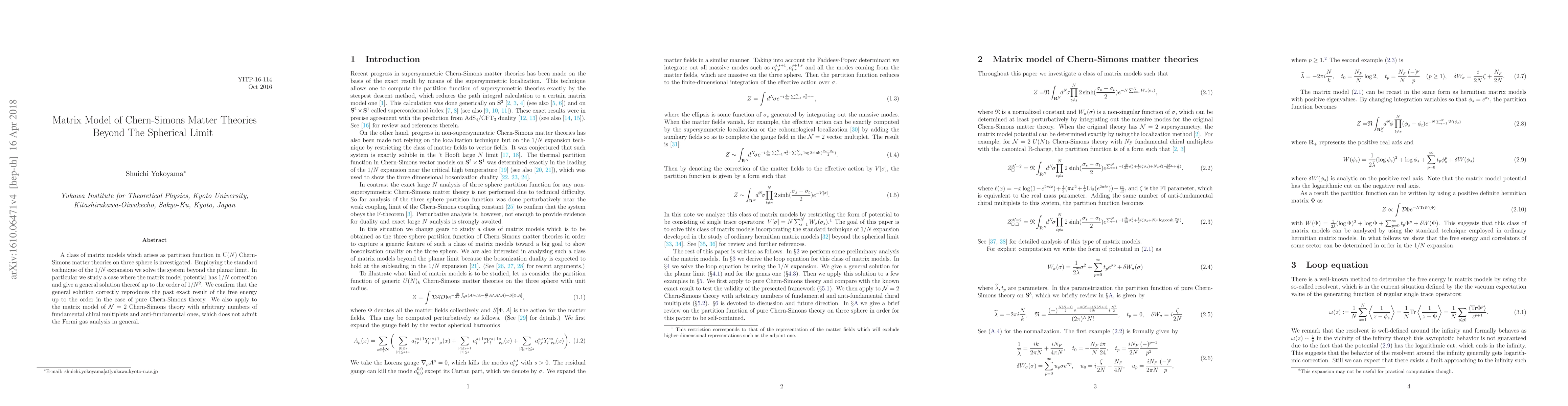 This research investigates matrix models for U(N) Chern-Simons matter theories beyond the spherical limit, solving the system using the 1/N expansion to include 1/N corrections up to 1/N^2. The study confirms the model's accuracy for pure Chern-Simons theory and extends it to N=2 Chern-Simons theory with multiplets.