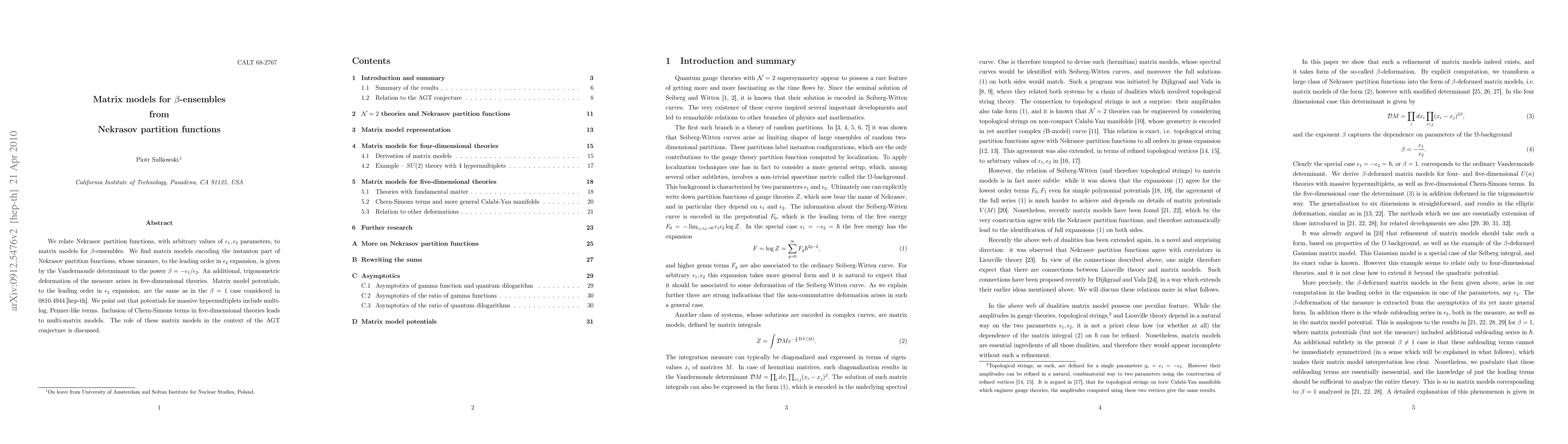 This paper connects Nekrasov partition functions to matrix models for $\beta$-ensembles, revealing that the matrix model measure is given by a Vandermonde determinant raised to the power $\beta$. It also discusses the implications of including Chern-Simons terms, leading to multi-matrix models, and their relevance to the AGT conjecture.