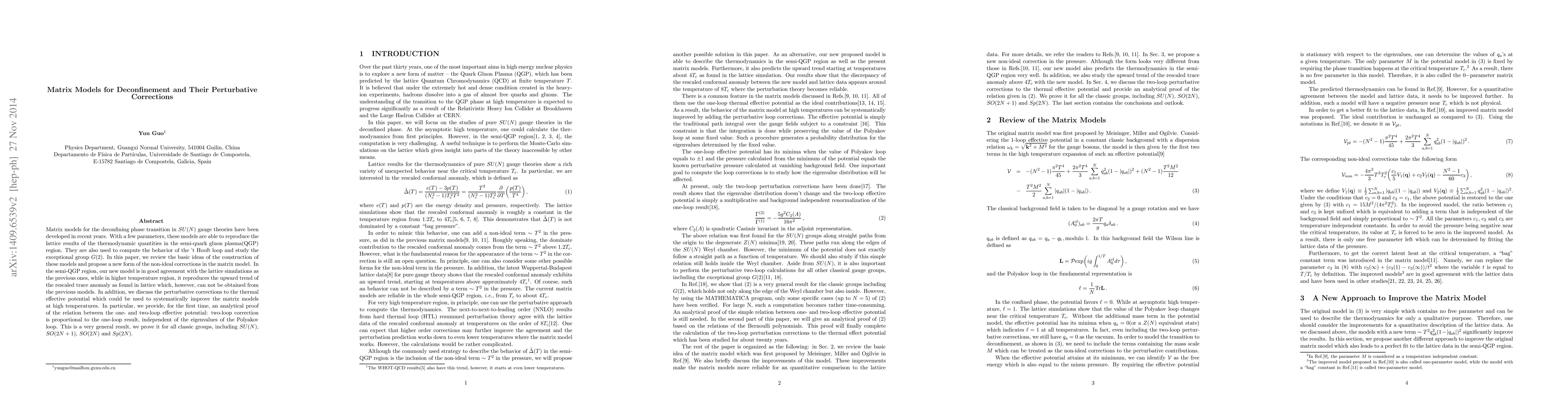 Matrix models for the deconfining phase transition in $SU(N)$ gauge theories have been developed in recent years. With a few parameters, these models are able to reproduce the lattice results of the thermodynamic quantities in the semi-quark gluon plasma(QGP) region. They are also used to compute the behavior of the 't Hooft loop and study the exceptional group $G(2)$. In this paper, we review the basic ideas of the construction of these models and propose a new form of the non-ideal corrections in the matrix model. In the semi-QGP region, our new model is in good agreement with the lattice simulations as the previous ones, while in higher temperature region, it reproduces the upward trend of the rescaled trace anomaly as found in lattice which, however, can not be obtained from the previous models. In addition, we discuss the perturbative corrections to the thermal effective potential which could be used to systematically improve the matrix models at high temperatures. In particular, we provide, for the first time, an analytical proof of the relation between the one- and two-loop effective potential: two-loop correction is proportional to the one-loop result, independent of the eigenvalues of the Polyakov loop. This is a very general result, we prove it for all classic groups, including $SU(N)$, $SO(2N+1)$, $SO(2N)$ and $Sp(2N)$.