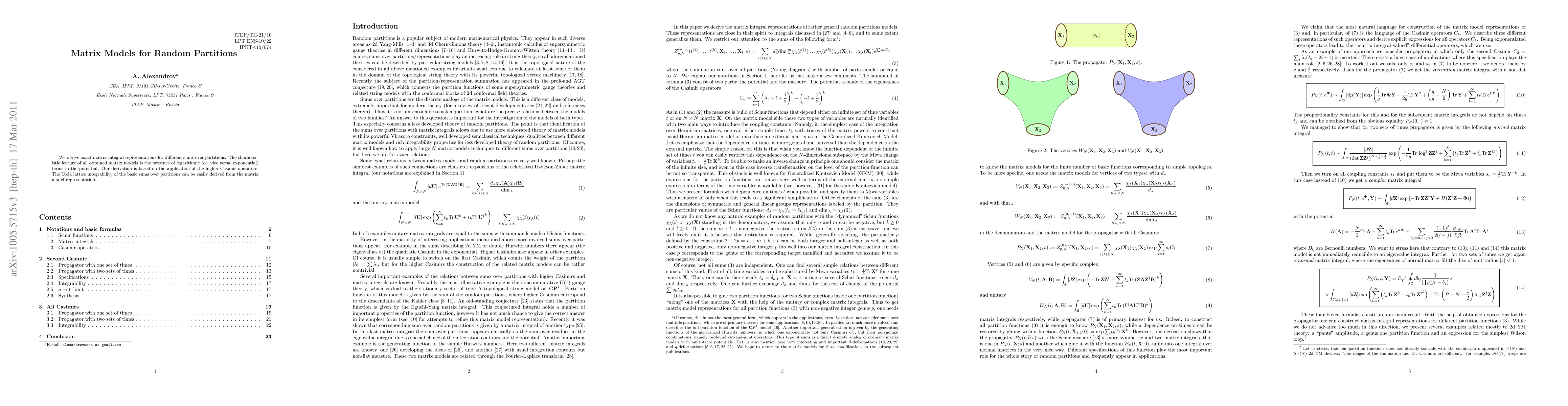 Summary: This paper derives exact matrix integral representations for sums over partitions, featuring logarithmic potentials, using higher Casimir operators. The Toda lattice integrability of these partition sums is demonstrated through the matrix model framework.