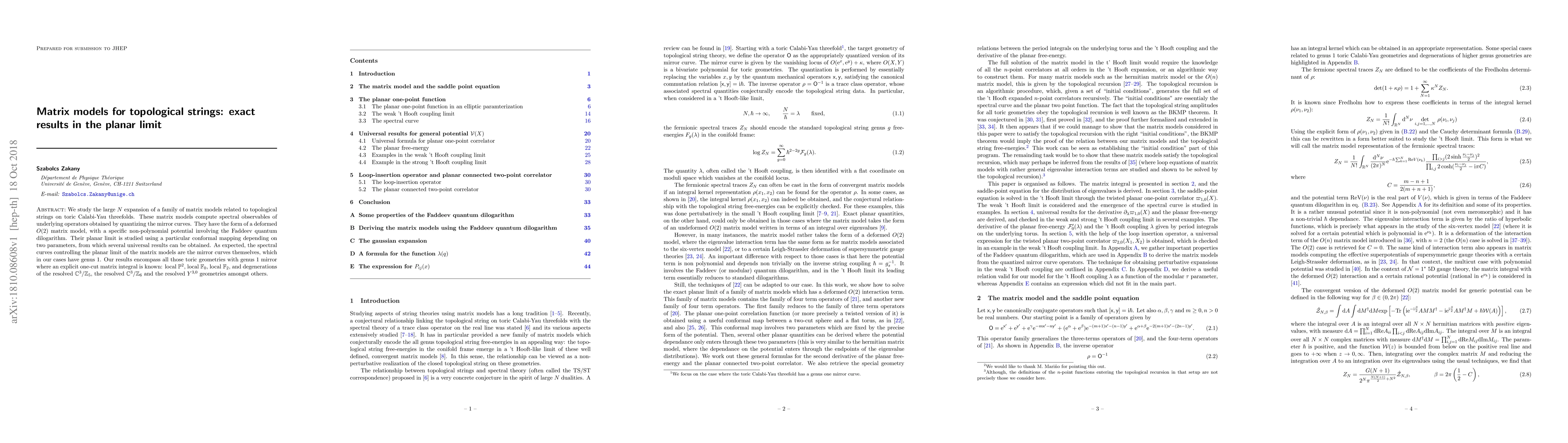 This paper investigates the large N expansion of matrix models linked to topological strings on toric Calabi-Yau threefolds, focusing on their planar limit through a specific conformal mapping. The study reveals universal results and confirms that the spectral curves are the mirror curves, particularly for genus $1$ geometries.