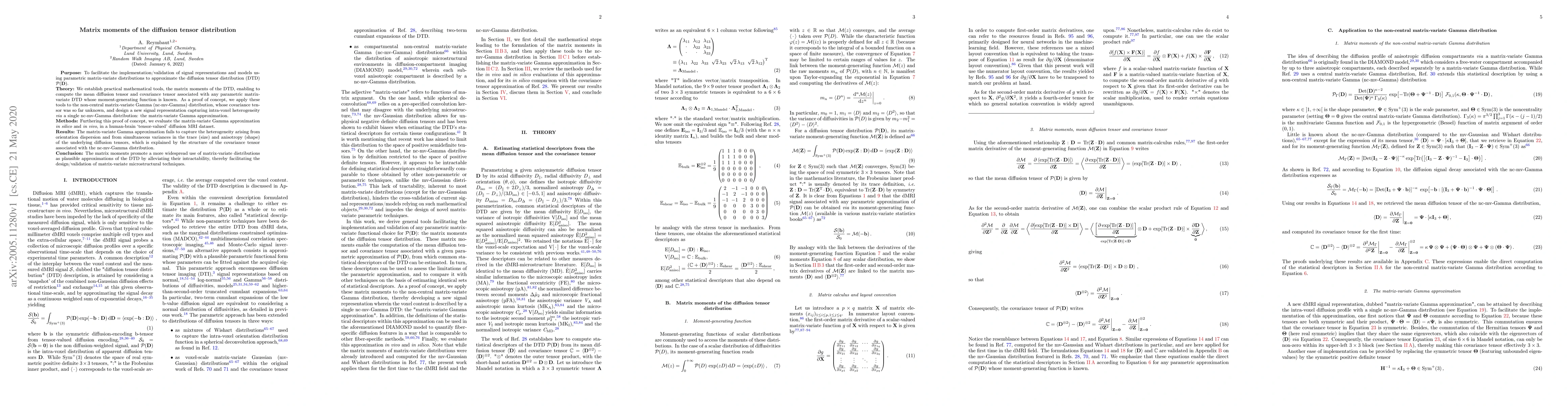 Purpose: To facilitate the implementation/validation of signal representations and models using parametric matrix-variate distributions to approximate the diffusion tensor distribution (DTD) $\mathcal{P}(\mathbf{D})$. Theory: We establish practical mathematical tools, the matrix moments of the DTD, enabling to compute the mean diffusion tensor and covariance tensor associated with any parametric matrix-variate DTD whose moment-generating function is known. As a proof of concept, we apply these tools to the non-central matrix-variate Gamma (nc-mv-Gamma) distribution, whose covariance tensor was so far unknown, and design a new signal representation capturing intra-voxel heterogeneity via a single nc-mv-Gamma distribution: the matrix-variate Gamma approximation. Methods: Furthering this proof of concept, we evaluate the matrix-variate Gamma approximation in silico and in vivo, in a human-brain 'tensor-valued' diffusion MRI dataset. Results: The matrix-variate Gamma approximation fails to capture the heterogeneity arising from orientation dispersion and from simultaneous variances in the trace (size) and anisotropy (shape) of the underlying diffusion tensors, which is explained by the structure of the covariance tensor associated with the nc-mv-Gamma distribution. Conclusion: The matrix moments promote a more widespread use of matrix-variate distributions as plausible approximations of the DTD by alleviating their intractability, thereby facilitating the design/validation of matrix-variate microstructural techniques.