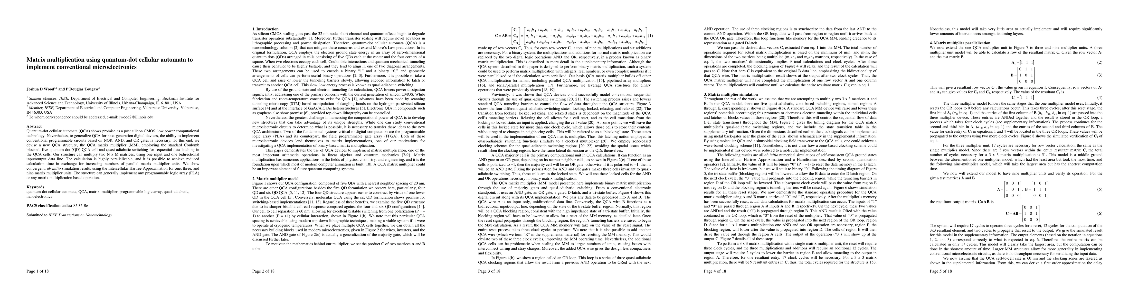 This paper proposes a novel QCA matrix multiplier structure for implementing conventional microelectronics using quantum-dot cellular automata, enabling low-power, highly parallelizable matrix multiplications. The QCA matrix multiplier is designed to generalize QCA for next-generation digital circuits, achieving reduced calculation time through parallelization.