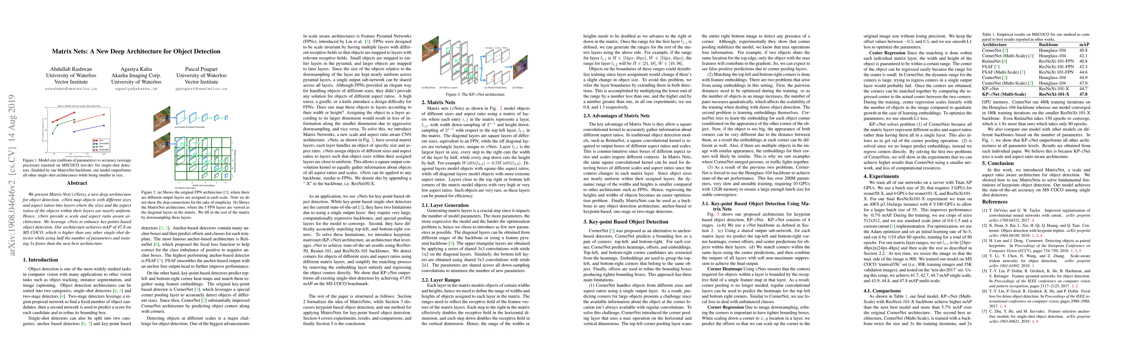 Matrix Nets (xNets) introduce a novel deep architecture for object detection that normalizes object sizes and aspect ratios, enabling scale and aspect ratio awareness and enhancing key-points based detection. This approach achieves a higher mean Average Precision (mAP) of 47.8 on MS COCO while using fewer parameters and training faster than other detectors.