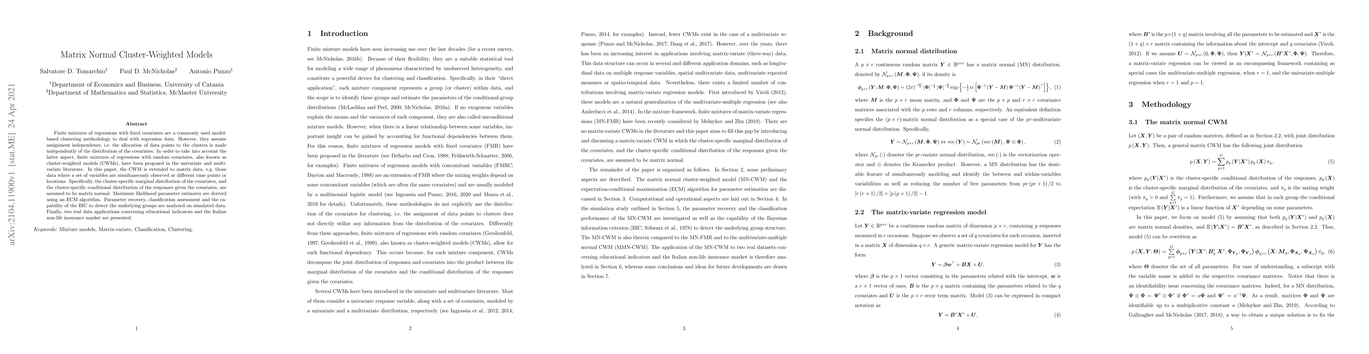 Researchers extend cluster-weighted models to matrix data, assuming cluster-specific marginal distributions of covariates and conditional responses given covariates as matrix normal. They use maximum likelihood parameter estimates and assess performance on simulated and real data.
