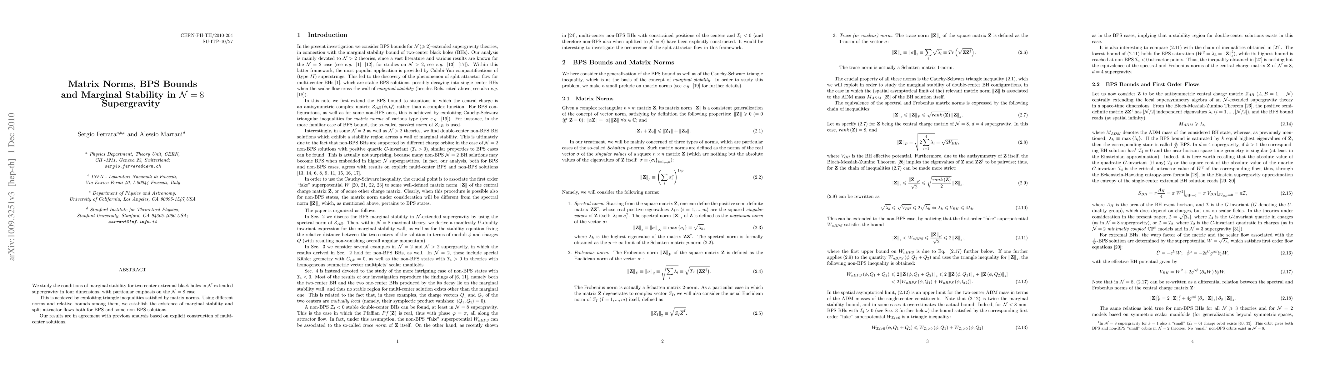 We study the conditions of marginal stability for two-center extremal black holes in N-extended supergravity in four dimensions, with particular emphasis on the N=8 case. This is achieved by exploiting triangle inequalities satisfied by matrix norms. Using different norms and relative bounds among them, we establish the existence of marginal stability and split attractor flows both for BPS and some non-BPS solutions. Our results are in agreement with previous analysis based on explicit construction of multi-center solutions.