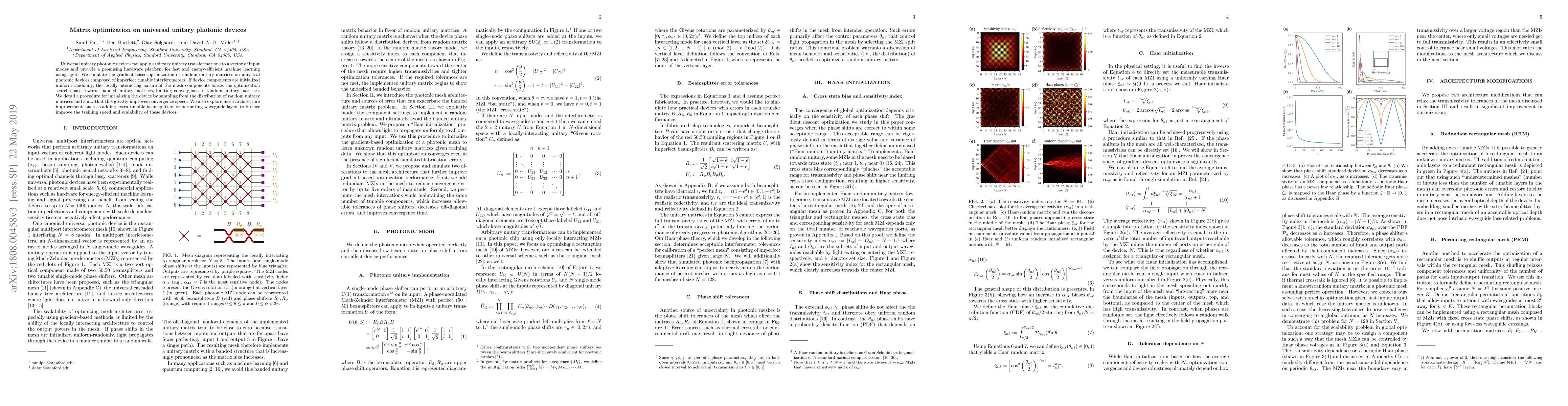 This paper investigates optimizing random unitary matrices on universal photonic devices for efficient machine learning. It finds that uniform-random initialization biases convergence towards banded matrices, but initializing from random unitary matrices significantly improves convergence speed. The study also explores architectural enhancements to further boost training speed and scalability.