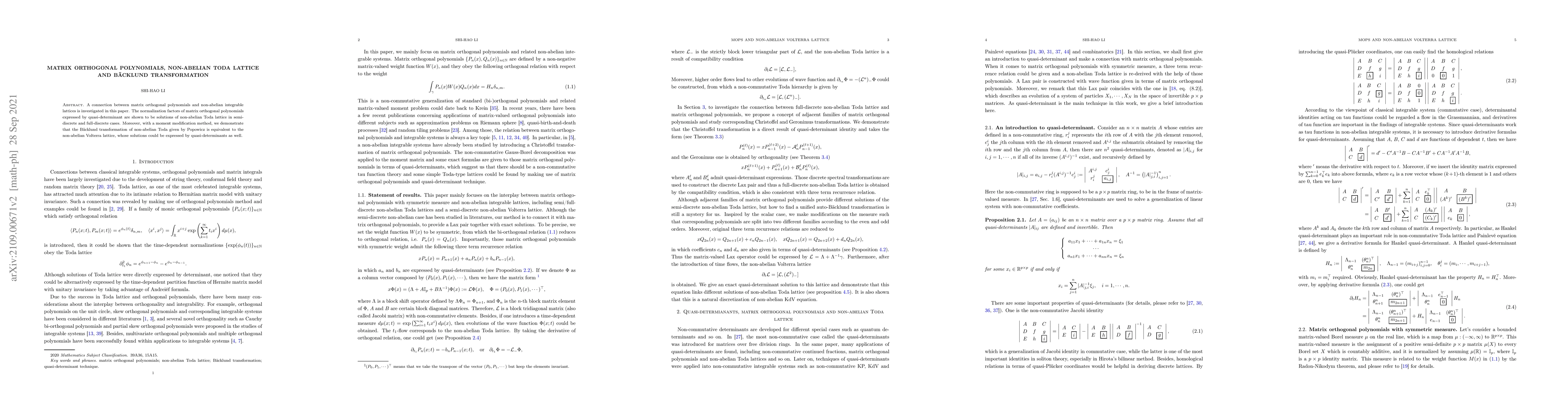 This paper establishes a link between matrix orthogonal polynomials and non-abelian integrable lattices, showing that their normalization factors solve the non-abelian Toda lattice. It also proves that Popowicz's Bäcklund transformation for the non-abelian Toda lattice is equivalent to the non-abelian Volterra lattice, both of whose solutions can be represented using quasi-determinants.