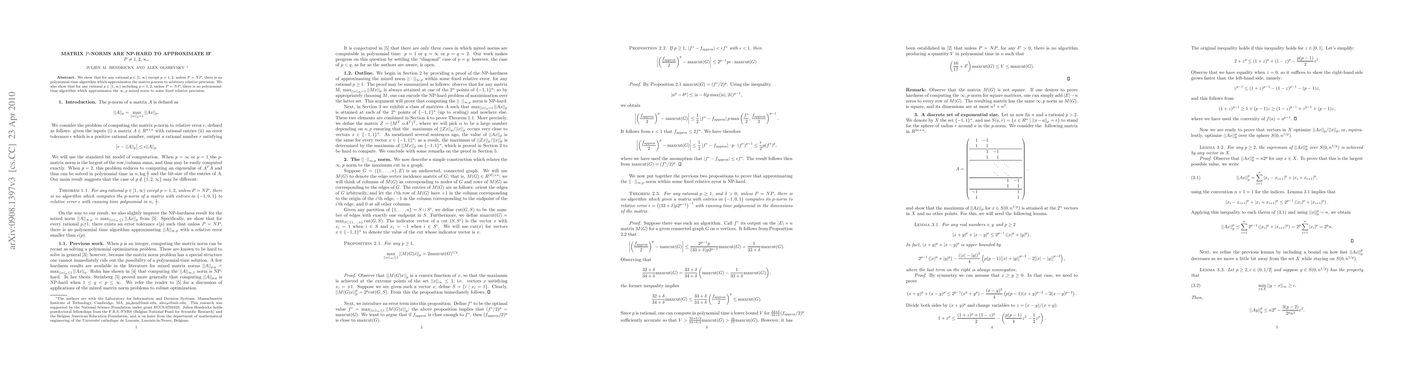 The paper shows that approximating certain matrix norms (p-norms) is NP-hard unless P=NP for non-integer values of p, indicating the limits of efficient computation for these problems.