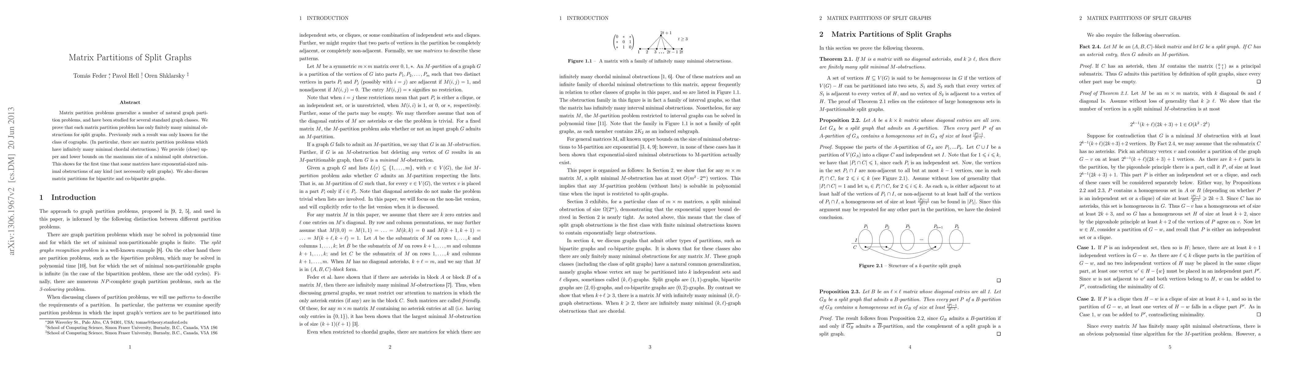 This paper proves that matrix partition problems have finitely many minimal obstructions for split graphs, a result previously only known for cographs. It also reveals that some matrices can have exponentially sized minimal obstructions, extending beyond split graphs, and discusses matrix partitions for bipartite and co-bipartite graphs.