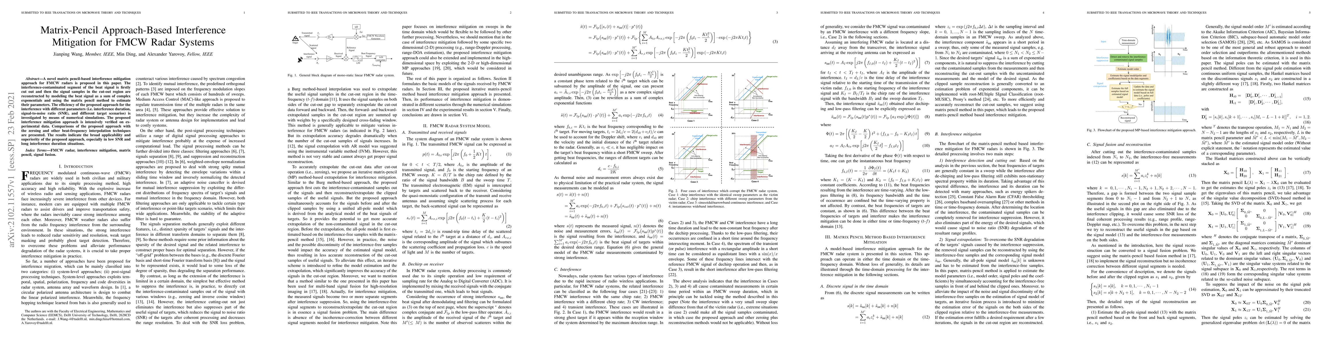 The paper proposes a matrix pencil-based interference mitigation technique for FMCW radars by reconstructing the interference-contaminated beat signal segment through complex exponential modeling. The approach demonstrates superior performance, particularly in low SNR and long interference duration scenarios, through numerical simulations and experimental data comparisons.