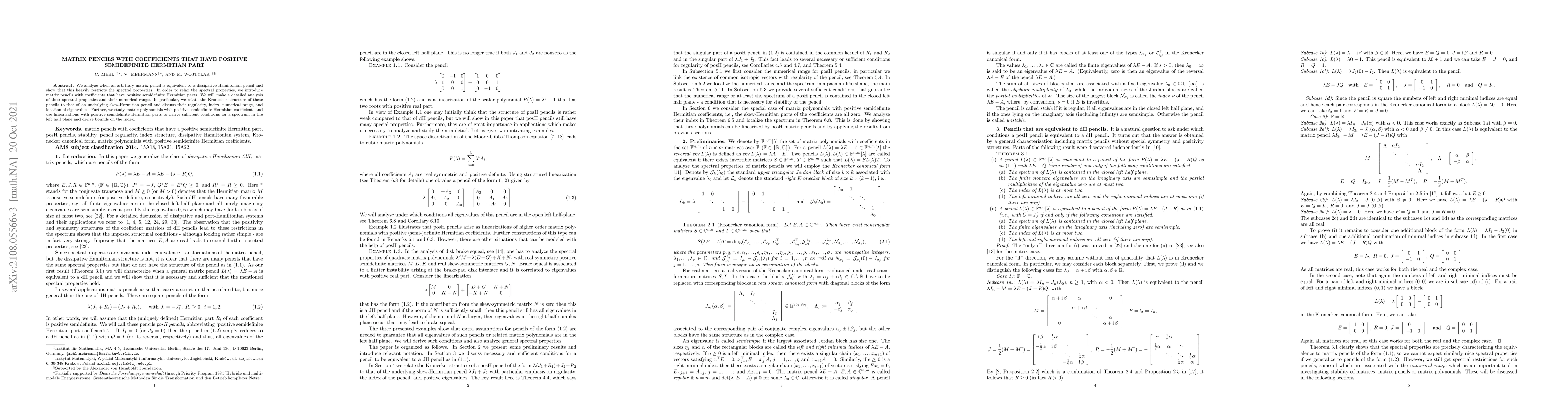 This paper investigates matrix pencils with coefficients possessing positive semidefinite Hermitian parts, establishing conditions under which such pencils are equivalent to dissipative Hamiltonian pencils. It analyzes their spectral properties, numerical range, and relates their Kronecker structure to underlying skew-Hermitian pencils, providing conditions for left half-plane spectra and bounds on the index.