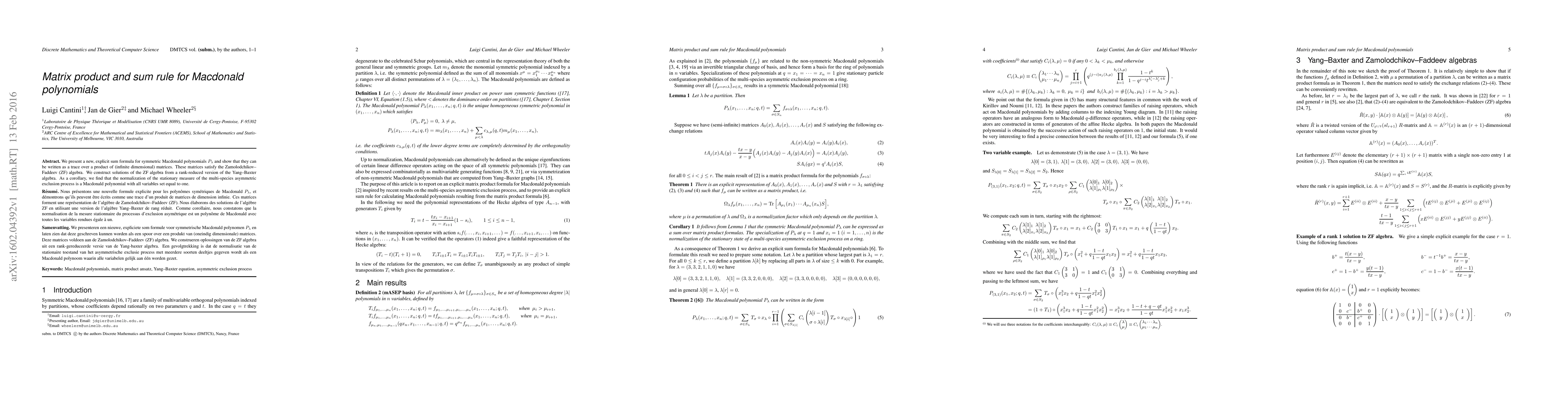 We present a new, explicit sum formula for symmetric Macdonald polynomials $P_\lambda$ and show that they can be written as a trace over a product of (infinite dimensional) matrices. These matrices satisfy the Zamolodchikov--Faddeev (ZF) algebra. We construct solutions of the ZF algebra from a rank-reduced version of the Yang--Baxter algebra. As a corollary, we find that the normalization of the stationary measure of the multi-species asymmetric exclusion process is a Macdonald polynomial with all variables set equal to one.