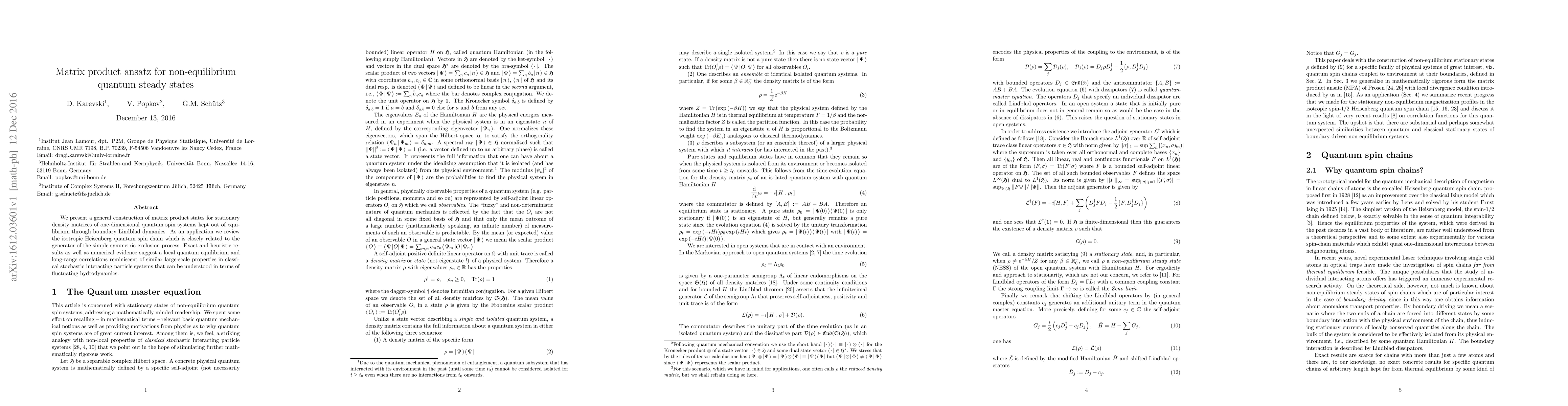 We present a general construction of matrix product states for stationary density matrices of one-dimensional quantum spin systems kept out of equilibrium through boundary Lindblad dynamics. As an application we review the isotropic Heisenberg quantum spin chain which is closely related to the generator of the simple symmetric exclusion process. Exact and heuristic results as well as numerical evidence suggest a local quantum equilibrium and long-range correlations reminiscent of similar large-scale properties in classical stochastic interacting particle systems that can be understood in terms of fluctuating hydrodynamics.