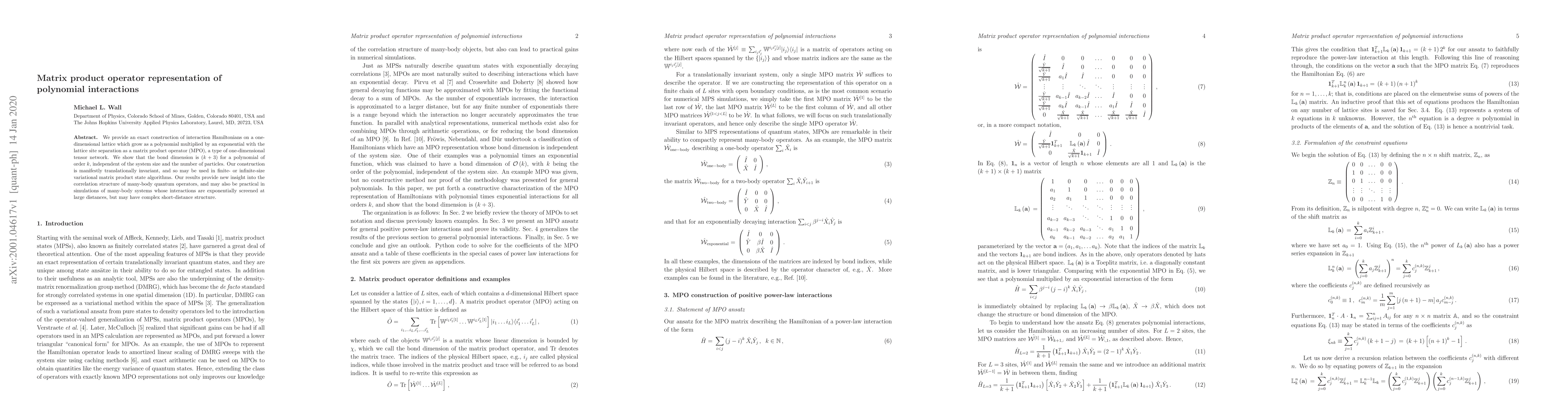 We provide an exact construction of interaction Hamiltonians on a one-dimensional lattice which grow as a polynomial multiplied by an exponential with the lattice site separation as a matrix product operator (MPO), a type of one-dimensional tensor network. We show that the bond dimension is $(k+3)$ for a polynomial of order $k$, independent of the system size and the number of particles. Our construction is manifestly translationally invariant, and so may be used in finite- or infinite-size variational matrix product state algorithms. Our results provide new insight into the correlation structure of many-body quantum operators, and may also be practical in simulations of many-body systems whose interactions are exponentially screened at large distances, but may have complex short-distance structure.