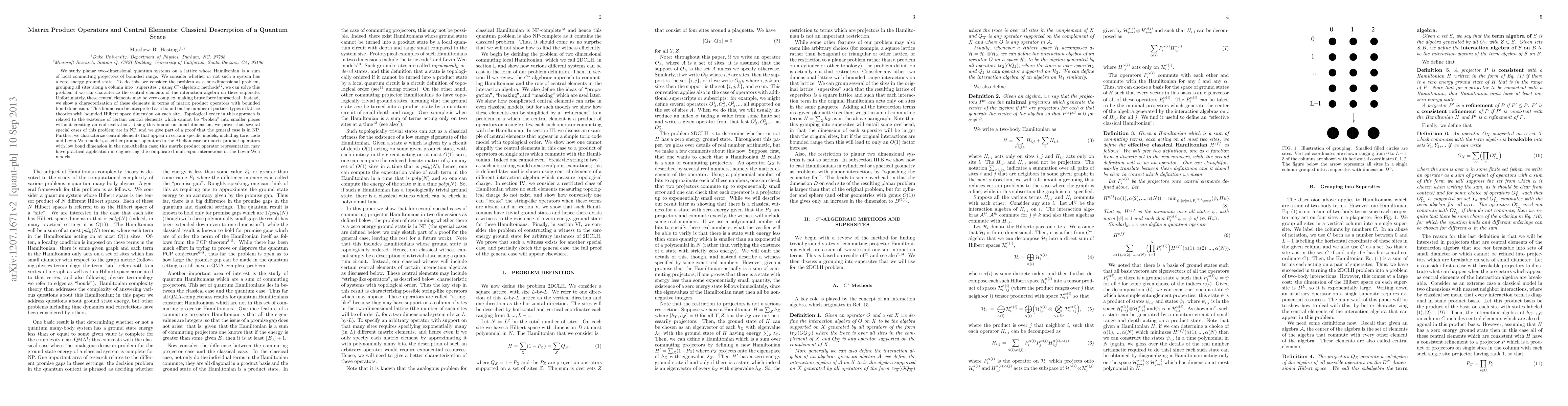 We study planar two-dimensional quantum systems on a lattice whose Hamiltonian is a sum of local commuting projectors of bounded range. We consider whether or not such a system has a zero energy ground state. To do this, we consider the problem as a one-dimensional problem, grouping all sites along a column into "supersites"; using $C^*$-algebraic methods (Bravyi and Vyalyi), we can solve this problem if we can characterize the central elements of the interaction algebra on these supersite. Unfortunately, these central elements may be very complex, making brute force impractical. Instead, we show a characterization of these elements in terms of matrix product operators with bounded bond dimension. This bound can be interpreted as a bound on the number of particle types in lattice theories with bounded Hilbert space dimension on each site. Topological order in this approach is related to the existence of certain central elements which cannot be "broken" into smaller pieces without creating an end excitation. Using this bound on bond dimension, we prove that several special cases of this problem are in NP, and we give part of a proof that the general case is in NP. Further, we characterize central elements that appear in certain specific models, including toric code and Levin-Wen models, as either product operators in the Abelian case or matrix product operators with low bond dimension in the non-Abelian case; this matrix product operator representation may have practical application in engineering the complicated multi-spin interactions in the Levin-Wen models.