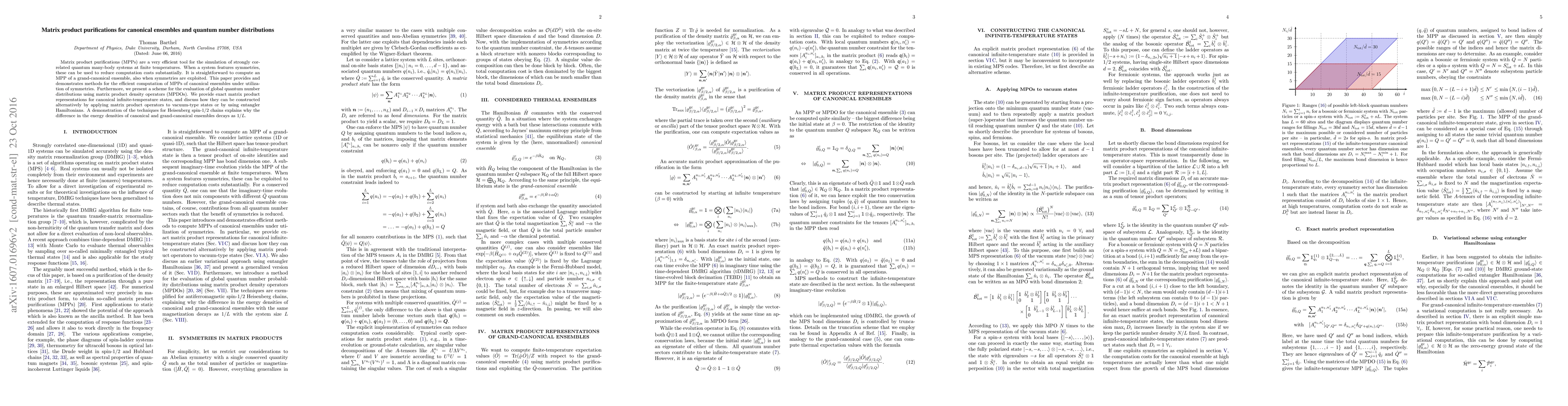 This paper introduces efficient methods for computing matrix product purifications of canonical ensembles leveraging symmetries, and presents a scheme for evaluating quantum number distributions using matrix product density operators. It demonstrates these techniques with exact representations for infinite-temperature states and a detailed analysis of Heisenberg spin-1/2 chains.