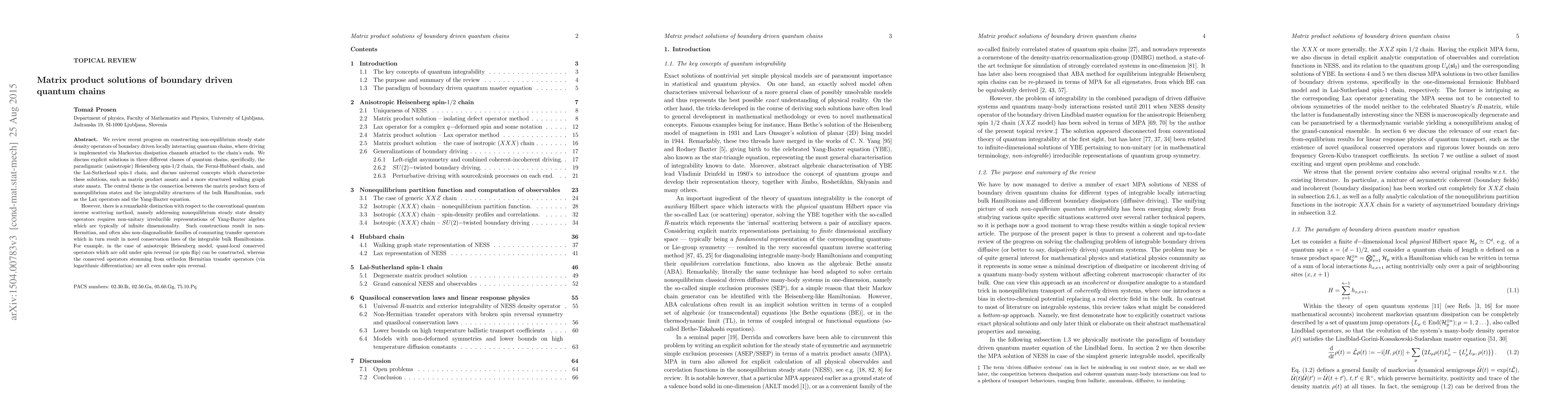 This paper reviews recent advancements in constructing non-equilibrium steady state density operators for boundary-driven quantum chains, focusing on matrix product solutions and integrability structures. It highlights novel conservation laws arising from non-Hermitian, non-diagonalisable transfer operators in systems like the Heisenberg spin-1/2 chain and the Fermi-Hubbard chain.