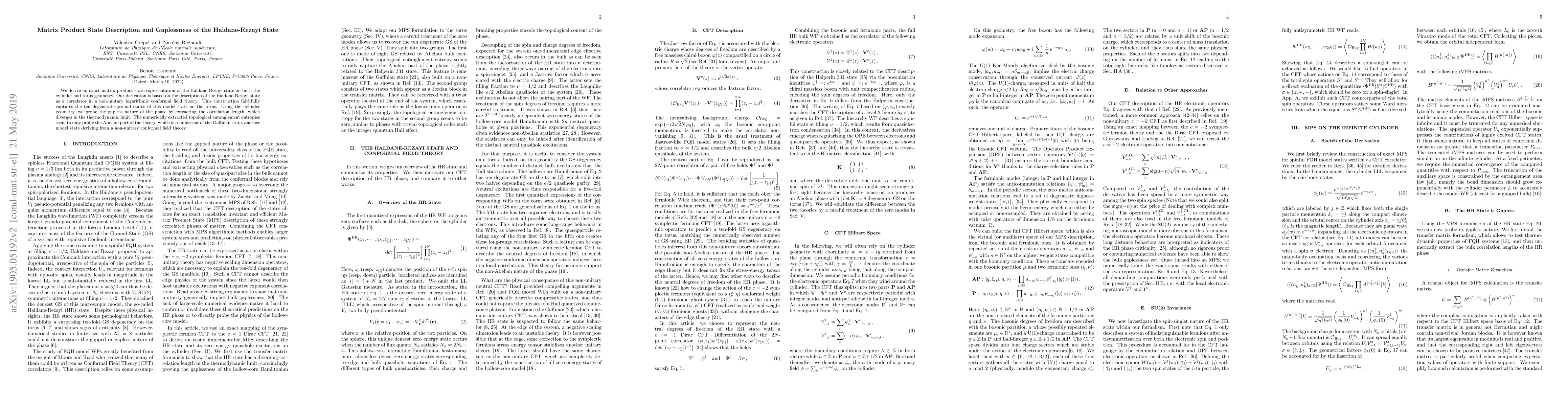 This paper presents an exact matrix product state representation for the Haldane-Rezayi state on cylinder and torus geometries, derived from a non-unitary logarithmic conformal field theory. It confirms the gapless nature of the phase by showing a diverging correlation length and suggests a focus on the Abelian part of the topological entanglement entropy.