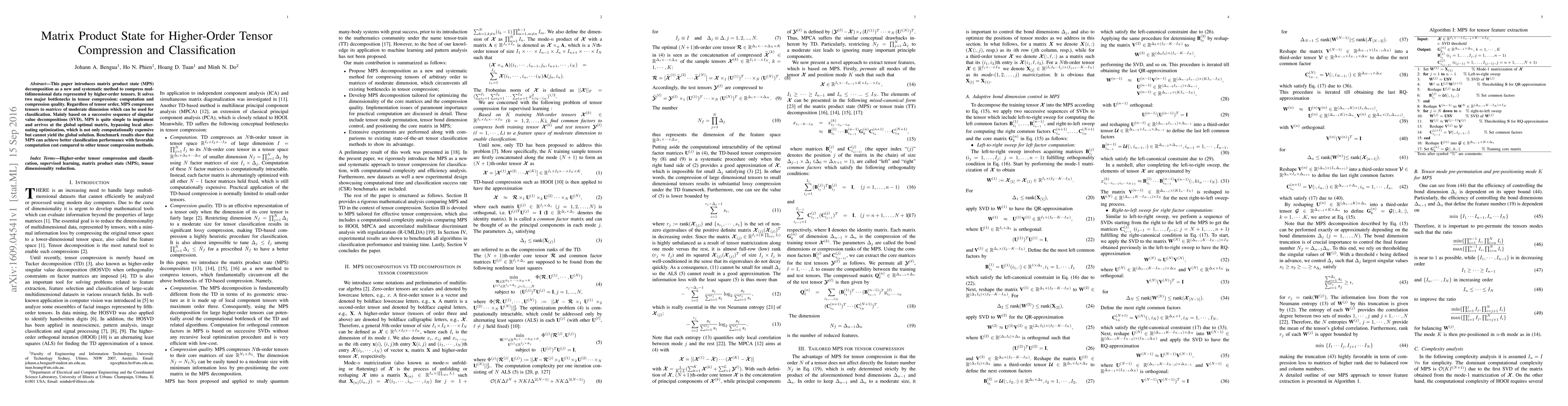 This paper introduces Matrix Product State (MPS) decomposition as a method to compress higher-order tensors, achieving better classification performance with favorable computation cost.