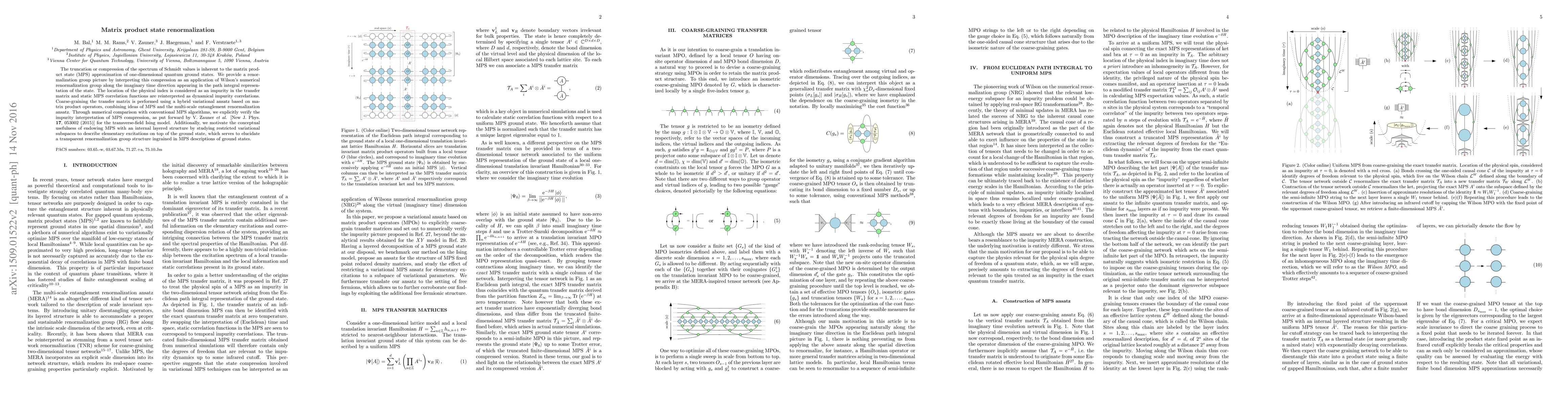 This paper develops a renormalization group framework for matrix product state (MPS) approximations, interpreting the compression of Schmidt values as Wilson's numerical renormalization group applied along the imaginary time direction. It introduces a hybrid variational ansatz for coarse-graining the transfer matrix and numerically verifies the impurity interpretation of MPS compression, while motivating the use of an internal layered structure in MPS for describing excitations.