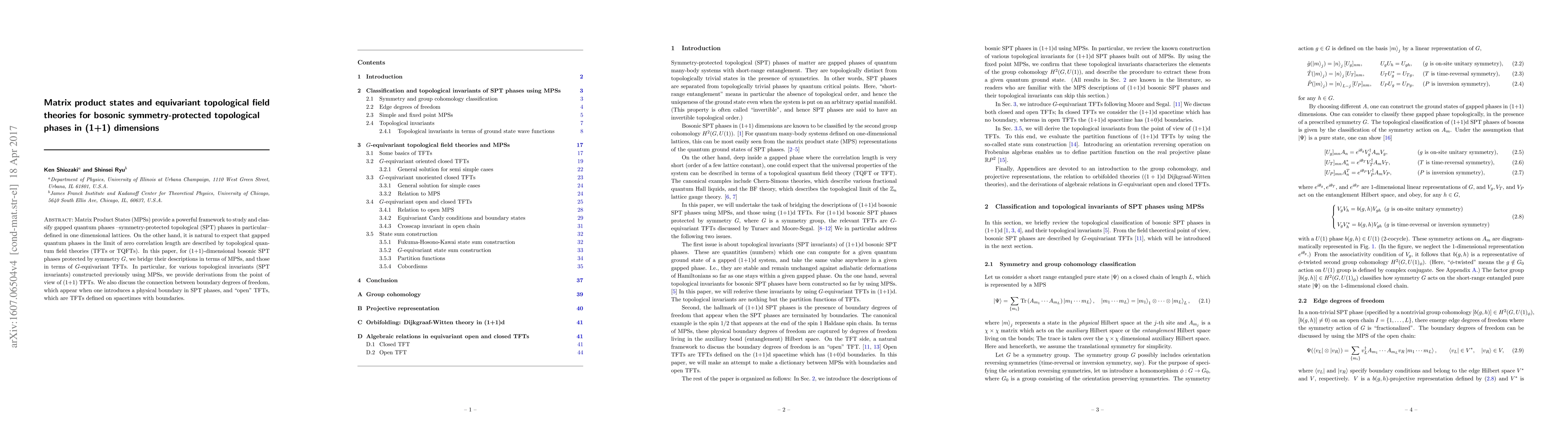 This paper connects Matrix Product States (MPS) with equivariant topological field theories (TFTs) to classify (1+1)-dimensional bosonic symmetry-protected topological (SPT) phases. It derives previously constructed SPT invariants from the perspective of (1+1) TFTs and explores the relationship between boundary degrees of freedom and open TFTs.