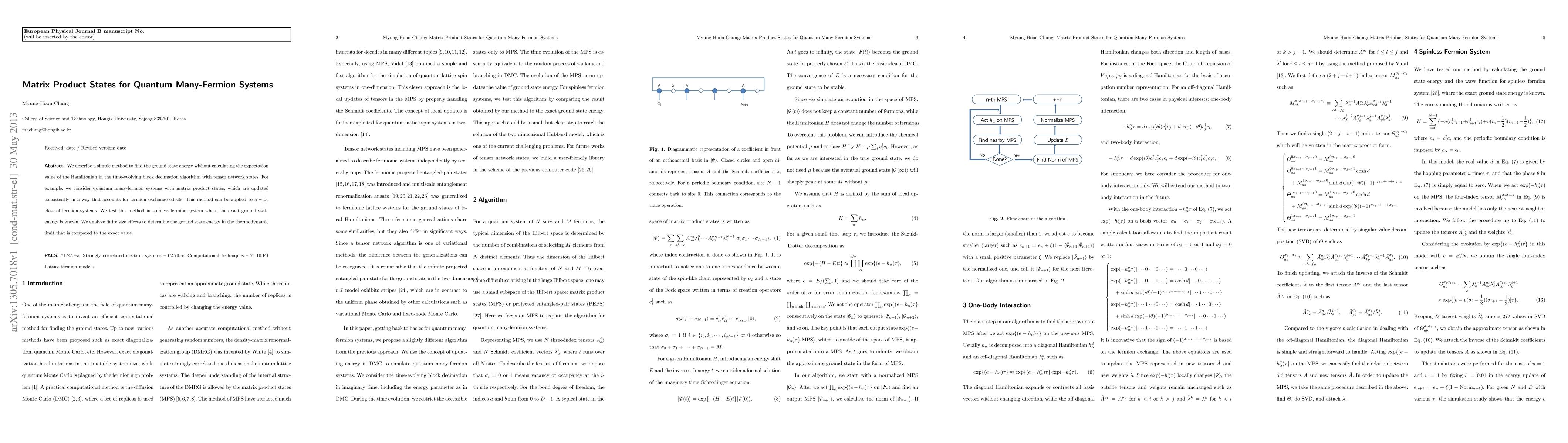This paper introduces a novel method for determining the ground state energy of quantum many-fermion systems using matrix product states within the time-evolving block decimation algorithm, avoiding direct Hamiltonian expectation calculations. The method is tested on a spinless fermion system, demonstrating its accuracy and applicability to a broad range of fermion systems.