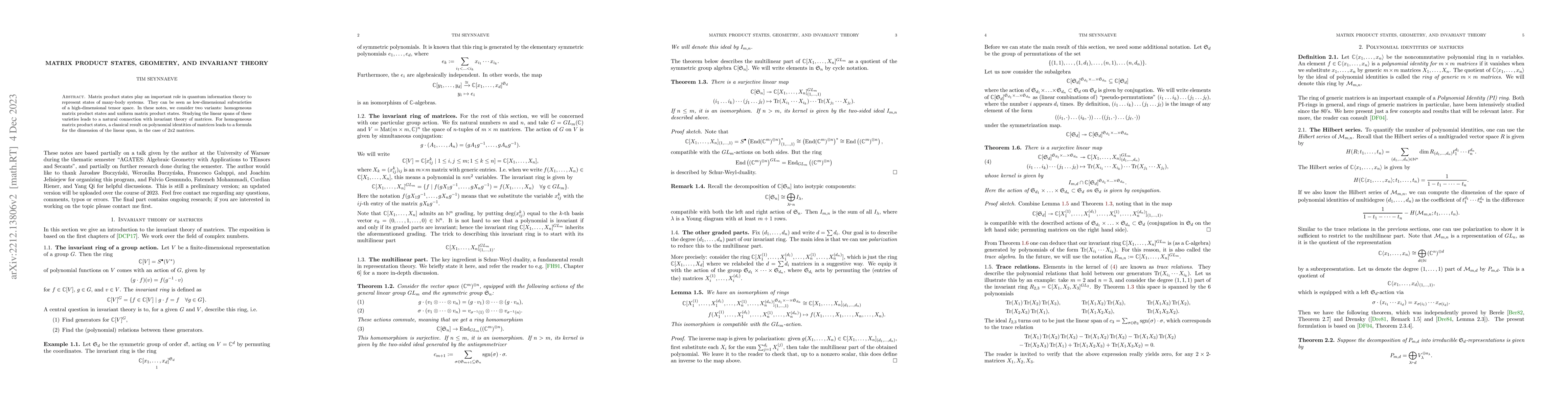 This paper explores matrix product states, which are crucial in quantum information theory for representing many-body systems, and examines their geometric and algebraic properties. It connects these states to invariant theory, particularly deriving a dimension formula for the linear span of homogeneous matrix product states using classical results on polynomial identities.