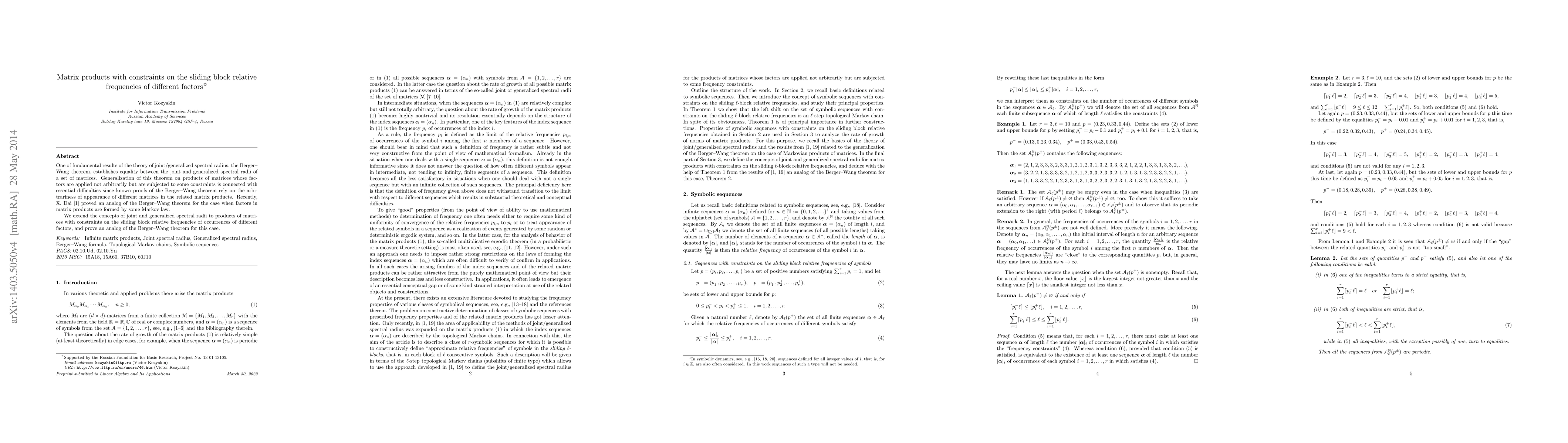 Researchers prove an analog of the Berger-Wang theorem for matrix products with constraints on relative frequencies of different factors, establishing equality between joint and generalized spectral radii.
