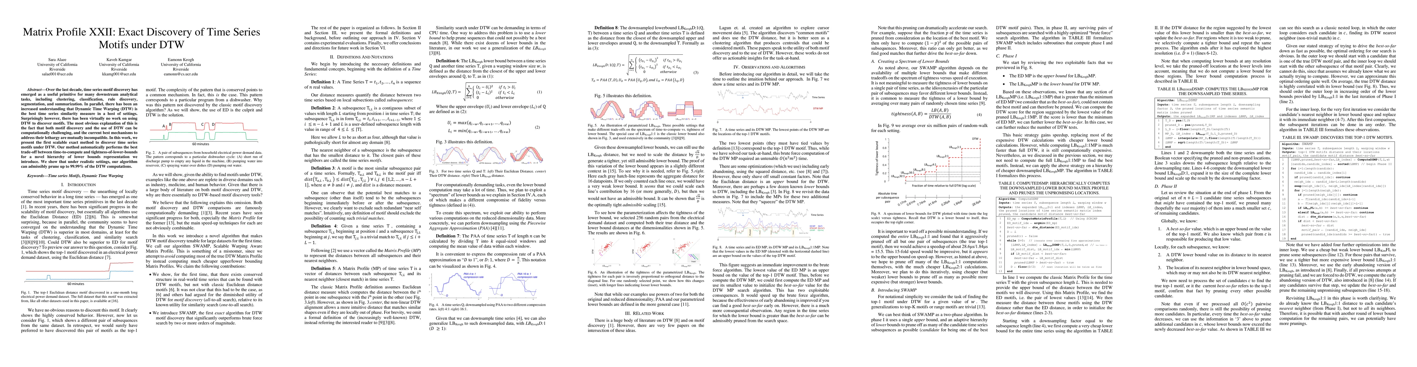 This paper introduces the first scalable exact method for discovering time series motifs using Dynamic Time Warping (DTW), addressing the computational challenges of both motif discovery and DTW. The proposed algorithm achieves significant pruning of DTW computations, enabling efficient motif discovery under DTW.