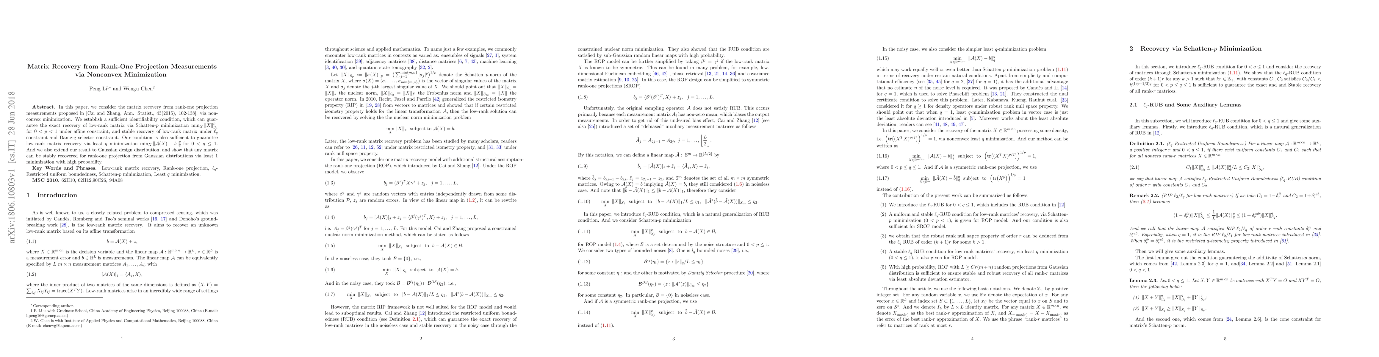 This paper proposes a method for matrix recovery using nonconvex minimization from rank-one projection measurements, establishing a sufficient identifiability condition for exact recovery via Schatten-$p$ minimization for $0<p<1$. It also guarantees stable recovery under $\ell_q$ and Dantzig selector constraints, extending results to Gaussian design distributions.