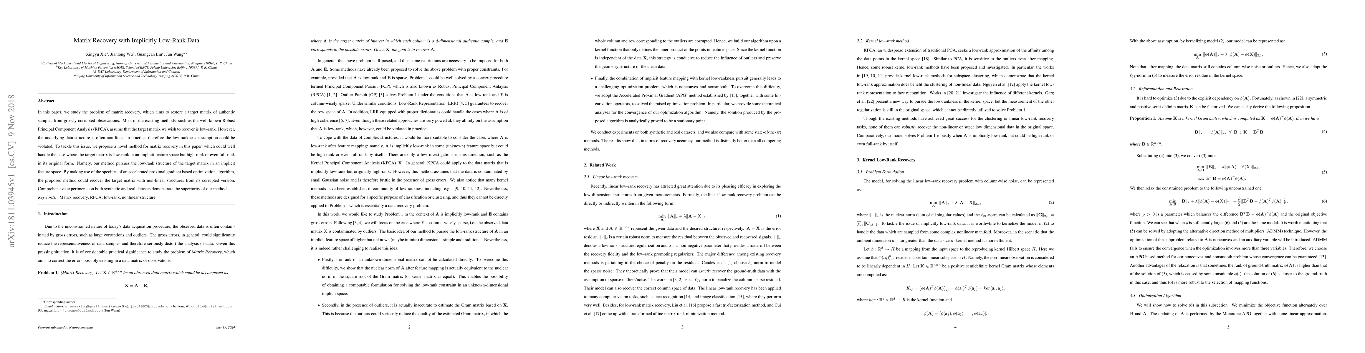 This paper proposes a novel matrix recovery method that effectively handles matrices with implicitly low-rank structures in feature spaces, rather than assuming strict low-rankness in the original form. The method uses an accelerated proximal gradient optimization algorithm to recover matrices with non-linear structures from corrupted observations, demonstrating superior performance on both synthetic and real datasets.