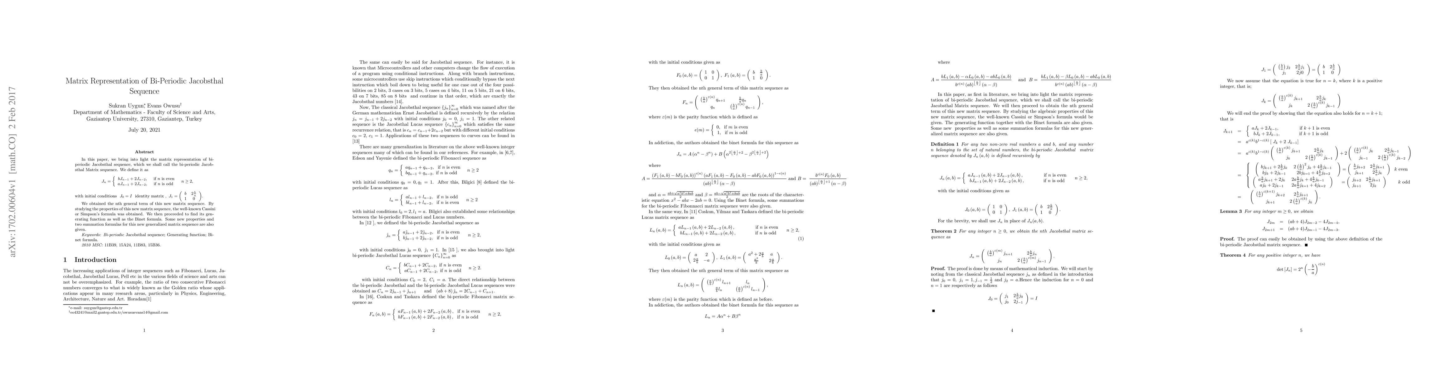 In this paper, we bring into light the matrix representation of bi-periodic Jacobsthal sequence, which we shall call the bi-periodic Jacobsthal Matrix sequence.. We obtained the nth general term of this new matrix sequence. By studying the properties of this new matrix sequence, the well-known Cassini or Simpson's formula was obtained. We then proceeded to find its generating function as well as the Binet formula. Some new properties and two summation formulas for this new generalized matrix sequence are also given. Keywords: Bi-periodic Jacobsthal sequence; Generating function; Binet formula.