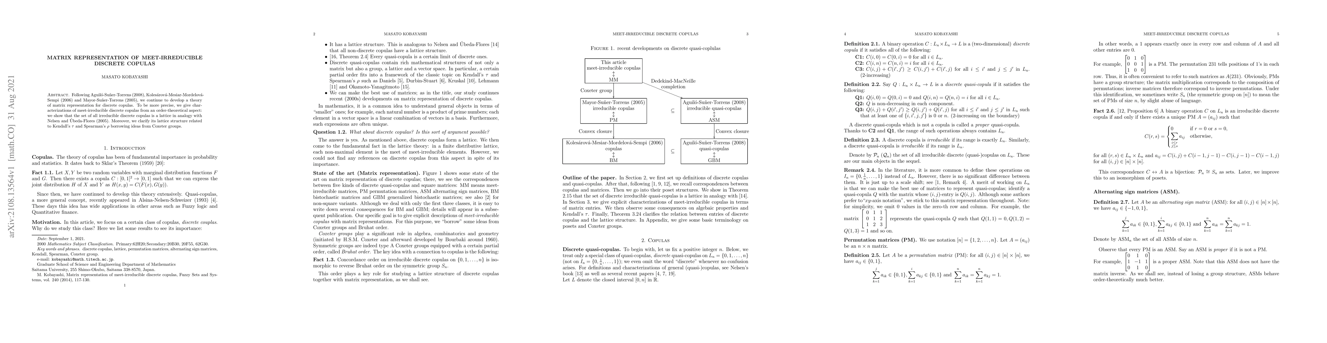 This paper develops a matrix representation theory for discrete copulas, focusing on characterizing meet-irreducible discrete copulas. It establishes the lattice structure of irreducible discrete copulas and connects it to Kendall's tau and Spearman's rho using concepts from Coxeter groups.