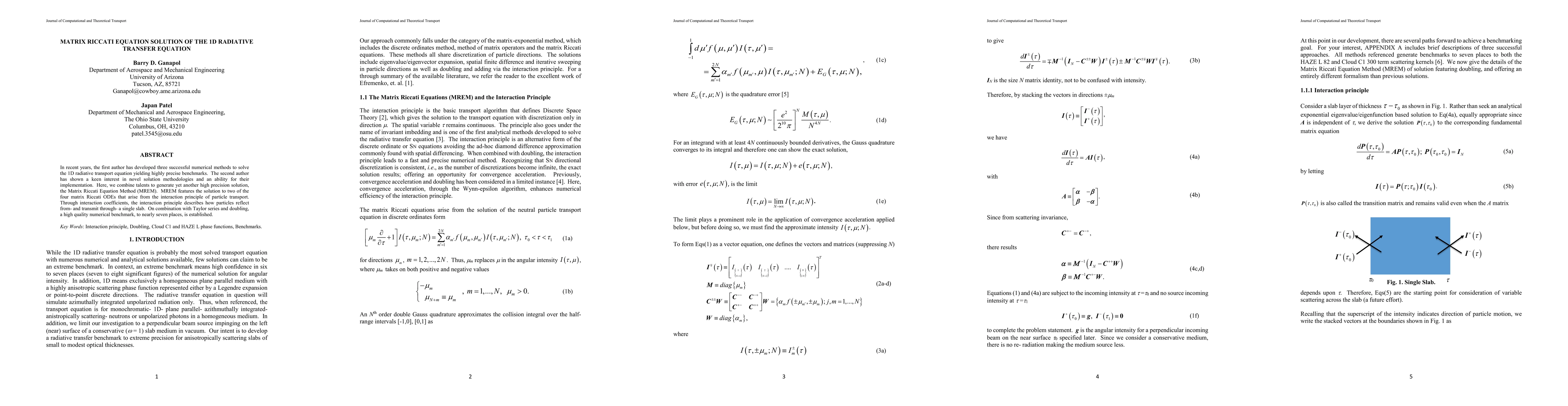 In recent years, the first author has developed three successful numerical methods to solve the 1D radiative transport equation yielding highly precise benchmarks. The second author has shown a keen interest in novel solution methodologies and an ability for their implementation. Here, we combine talents to generate yet another high precision solution, the Matrix Riccati Equation Method (MREM). MREM features the solution to two of the four matrix Riccati ODEs that arise from the interaction principle of particle transport. Through interaction coefficients, the interaction principle describes how particles reflect from- and transmit through- a single slab. On combination with Taylor series and doubling, a high quality numerical benchmark, to nearly seven places, is established.