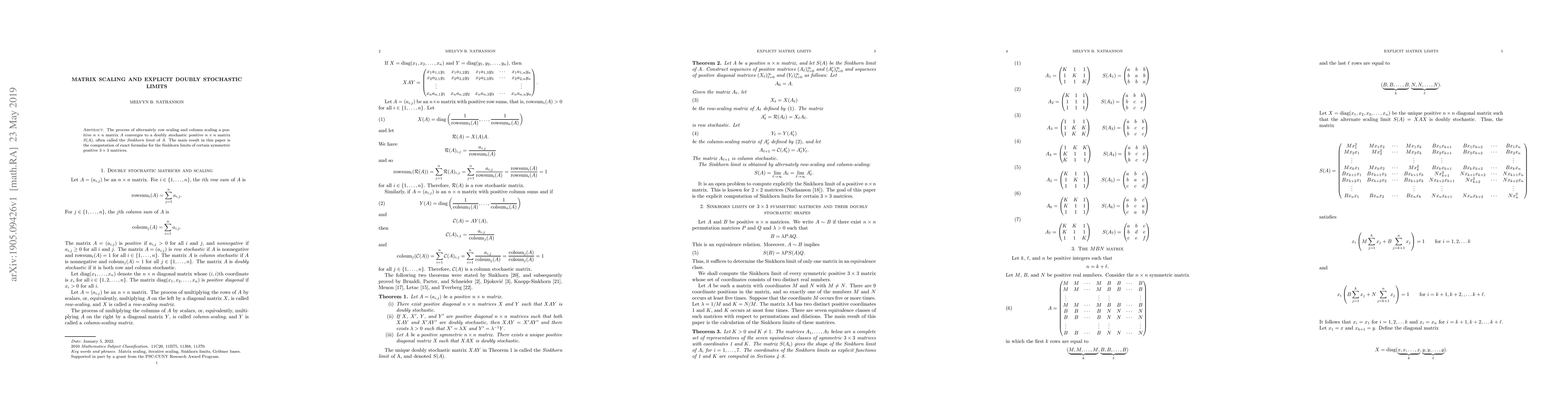 This paper investigates the convergence of alternately row and column scaling of positive matrices to doubly stochastic matrices, known as Sinkhorn limits. The authors provide exact formulae for the Sinkhorn limits of specific symmetric positive $3 \times 3$ matrices.
