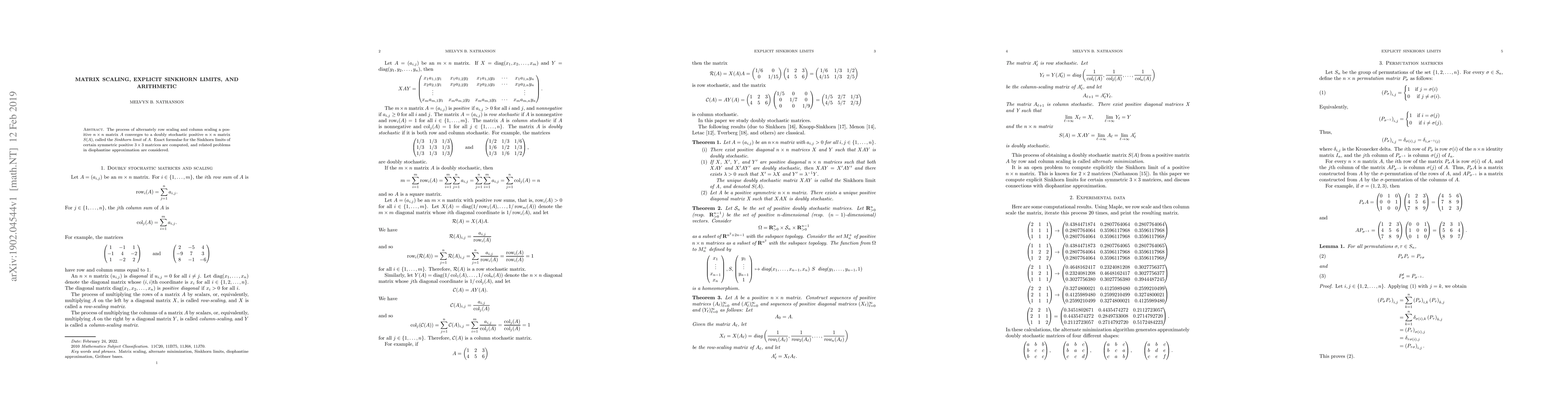 This paper explores the convergence of alternately row and column scaling of a positive matrix to a doubly stochastic matrix, known as the Sinkhorn limit. It provides exact formulae for the Sinkhorn limits of specific symmetric positive $3\times 3$ matrices and discusses related problems in diophantine approximation.