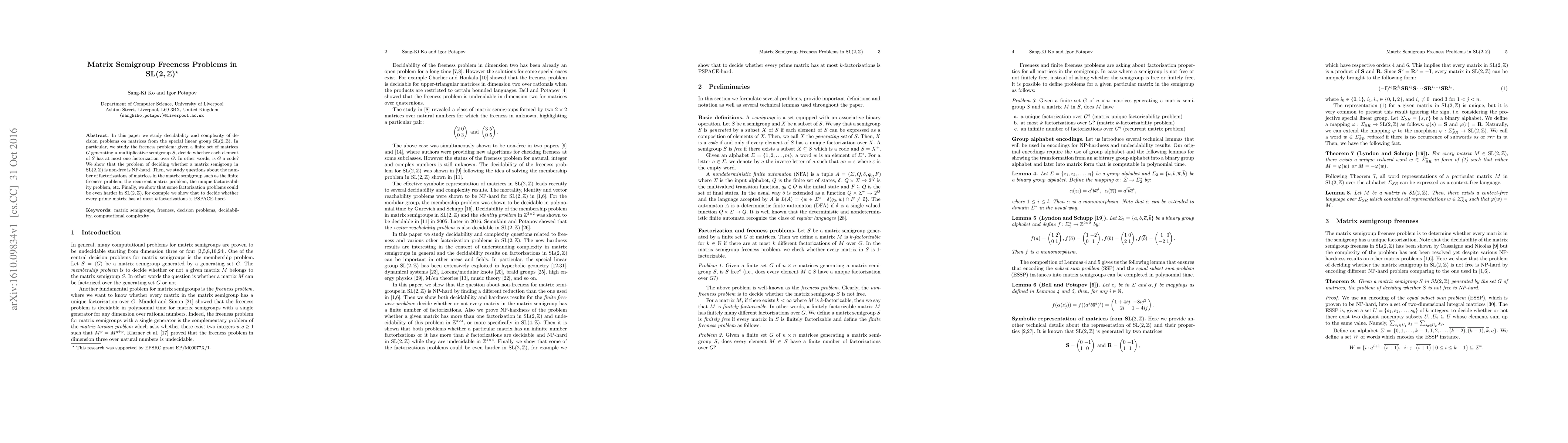 In this paper we study decidability and complexity of decision problems on matrices from the special linear group $\mathrm{SL}(2,\mathbb{Z})$. In particular, we study the freeness problem: given a finite set of matrices $G$ generating a multiplicative semigroup $S$, decide whether each element of $S$ has at most one factorization over $G$. In other words, is $G$ a code? We show that the problem of deciding whether a matrix semigroup in $\mathrm{SL}(2,\mathbb{Z})$ is non-free is NP-hard. Then, we study questions about the number of factorizations of matrices in the matrix semigroup such as the finite freeness problem, the recurrent matrix problem, the unique factorizability problem, etc. Finally, we show that some factorization problems could be even harder in $\mathrm{SL}(2,\mathbb{Z})$, for example we show that to decide whether every prime matrix has at most $k$ factorizations is PSPACE-hard.