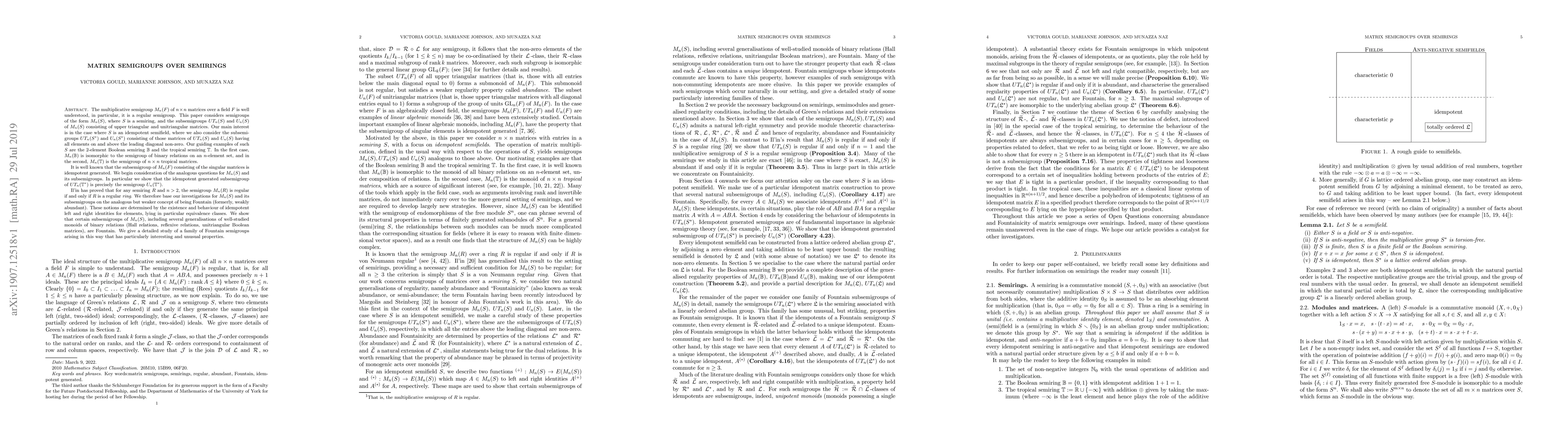 The multiplicative semigroup $M_n(F)$ of $n\times n$ matrices over a field $F$ is well understood, in particular, it is a regular semigroup. This paper considers semigroups of the form $M_n(S)$, where $S$ is a semiring, and the subsemigroups $UT_n(S)$ and $U_n(S)$ of $M_n(S)$ consisting of upper triangular and unitriangular matrices. Our main interest is in the case where $S$ is an idempotent semifield, where we also consider the subsemigroups $UT_n(S^*)$ and $U_n(S^*)$ consisting of those matrices of $UT_n(S)$ and $U_n(S)$ having all elements on and above the leading diagonal non-zero. Our guiding examples of such $S$ are the 2-element Boolean semiring $\mathbb{B}$ and the tropical semiring $\mathbb{T}$. In the first case, $M_n(\mathbb{B})$ is isomorphic to the semigroup of binary relations on an $n$-element set, and in the second, $M_n(\mathbb{T})$ is the semigroup of $n\times n$ tropical matrices. Il'in has proved that for any semiring $R$ and $n>2$, the semigroup $M_n(R)$ is regular if and only if $R$ is a regular ring. We therefore base our investigations for $M_n(S)$ and its subsemigroups on the analogous but weaker concept of being Fountain (formerly, weakly abundant). These notions are determined by the existence and behaviour of idempotent left and right identities for elements, lying in particular equivalence classes. We show that certain subsemigroups of $M_n(S)$, including several generalisations of well-studied monoids of binary relations (Hall relations, reflexive relations, unitriangular Boolean matrices), are Fountain. We give a detailed study of a family of Fountain semigroups arising in this way that has particularly interesting and unusual properties.