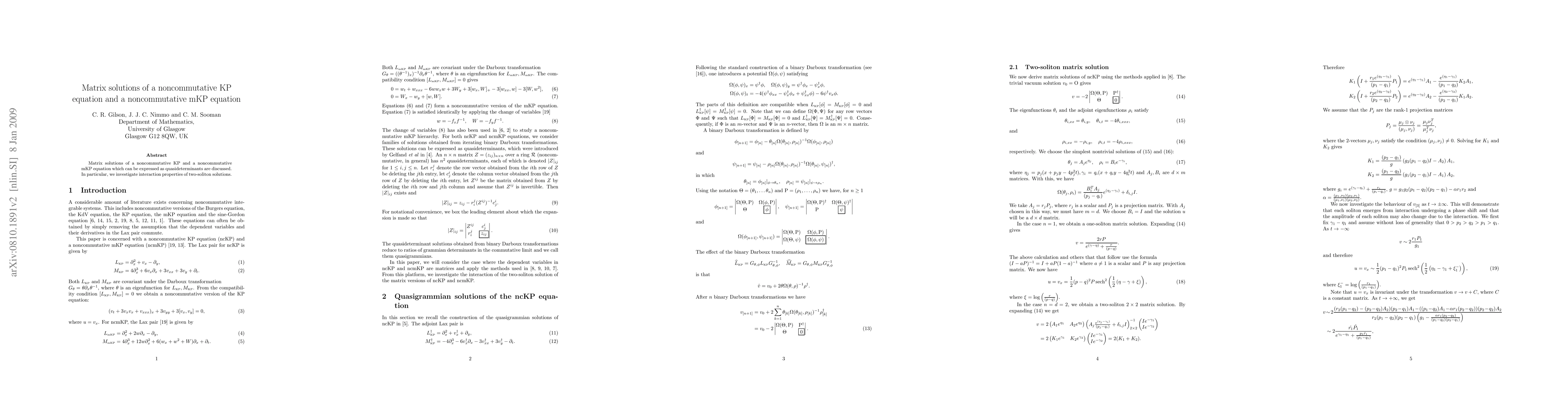 Summary: This paper explores matrix solutions for noncommutative KP and mKP equations, represented as quasideterminants, and examines the interaction properties of their two-soliton solutions.