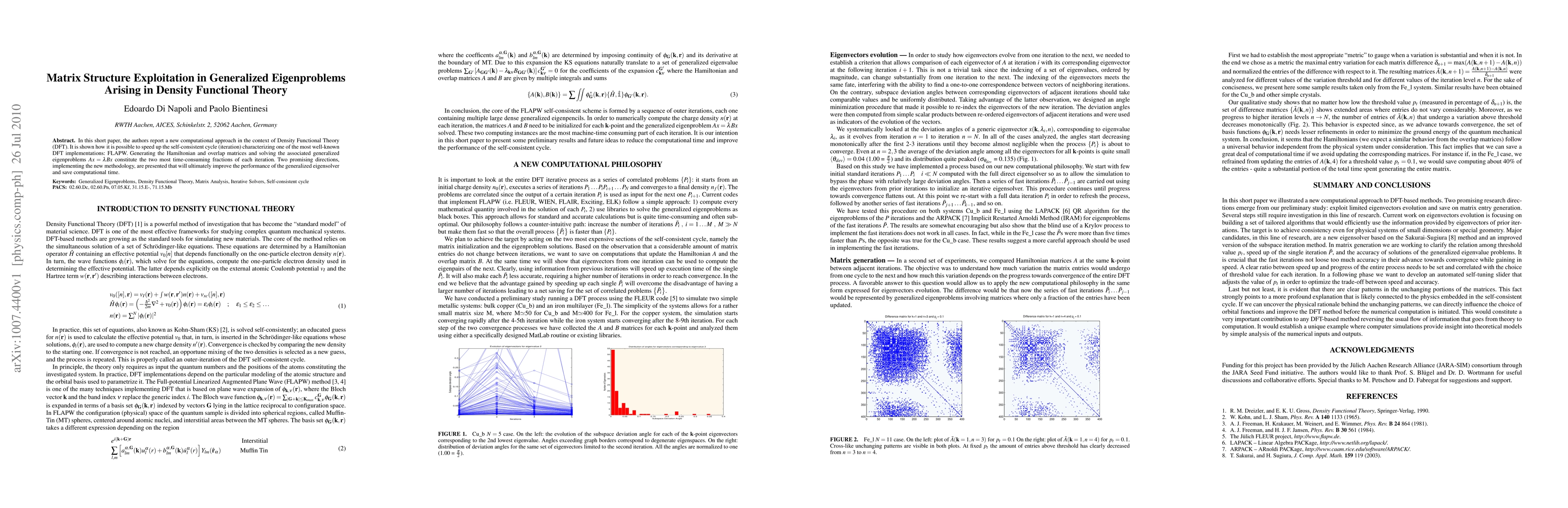 In this short paper, the authors report a new computational approach in the context of Density Functional Theory (DFT). It is shown how it is possible to speed up the self-consistent cycle (iteration) characterizing one of the most well-known DFT implementations: FLAPW. Generating the Hamiltonian and overlap matrices and solving the associated generalized eigenproblems $Ax = \lambda Bx$ constitute the two most time-consuming fractions of each iteration. Two promising directions, implementing the new methodology, are presented that will ultimately improve the performance of the generalized eigensolver and save computational time.