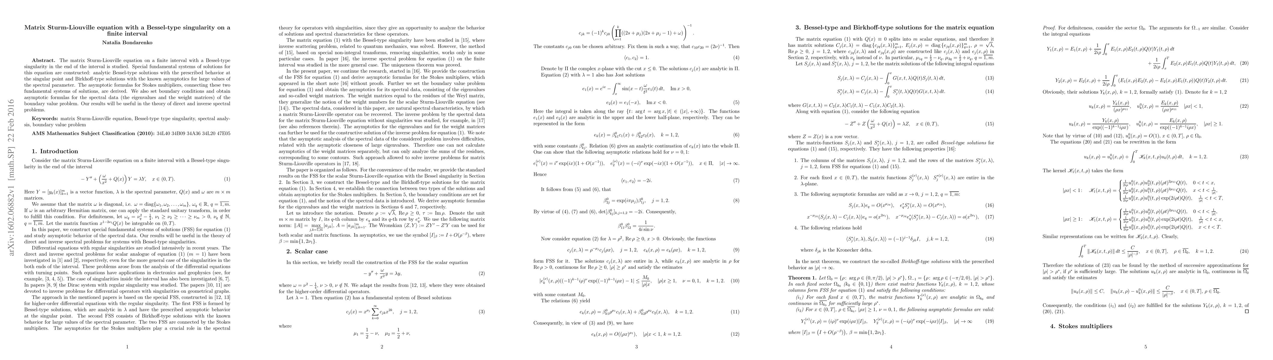 The matrix Sturm-Liouville equation on a finite interval with a Bessel-type singularity in the end of the interval is studied. Special fundamental systems of solutions for this equation are constructed: analytic Bessel-type solutions with the prescribed behavior at the singular point and Birkhoff-type solutions with the known asymptotics for large values of the spectral parameter. The asymptotic formulas for Stokes multipliers, connecting these two fundamental systems of solutions, are derived. We also set boundary conditions and obtain asymptotic formulas for the spectral data (the eigenvalues and the weight matrices) of the boundary value problem. Our results will be useful in the theory of direct and inverse spectral problems.