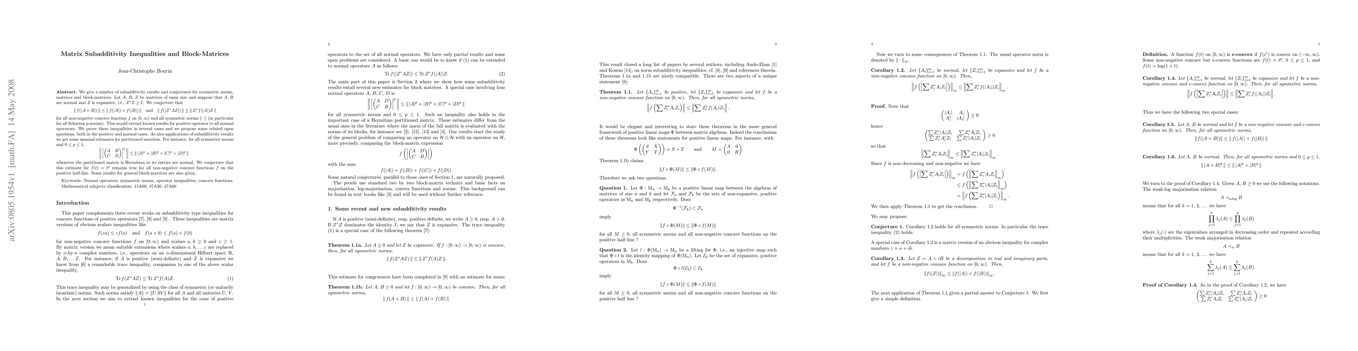 Several subadditivity results and conjectures are given for matrices (or operators), block-matrices, concave functions and norms.