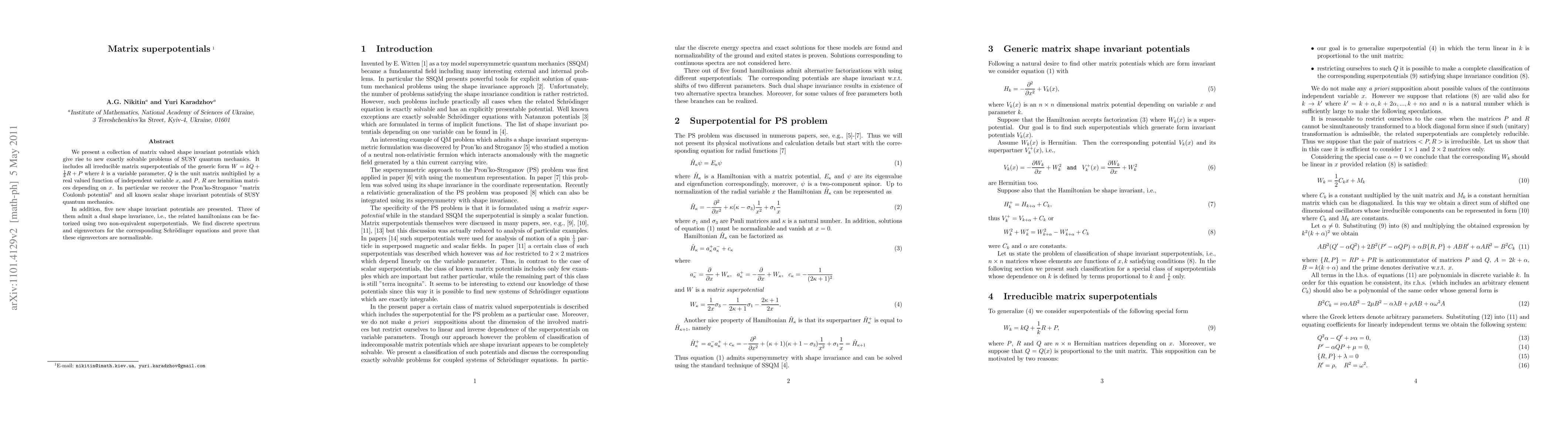 The paper introduces a comprehensive classification of irreducible matrix-valued shape-invariant superpotentials, extending the scope of exactly solvable problems in SUSY QM, and identifies five new potentials with dual shape invariance.