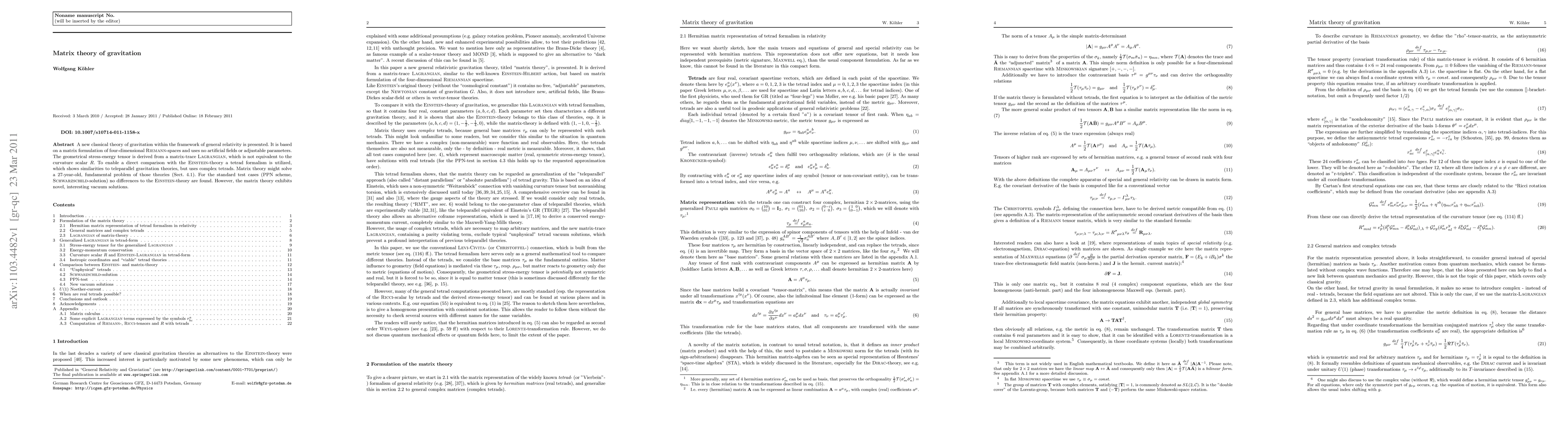 The paper introduces a matrix formulation of gravitation that uses a Lagrangian based on a matrix-trace, leading to a geometrical stress-energy tensor without relying on artificial fields or adjustable parameters.
