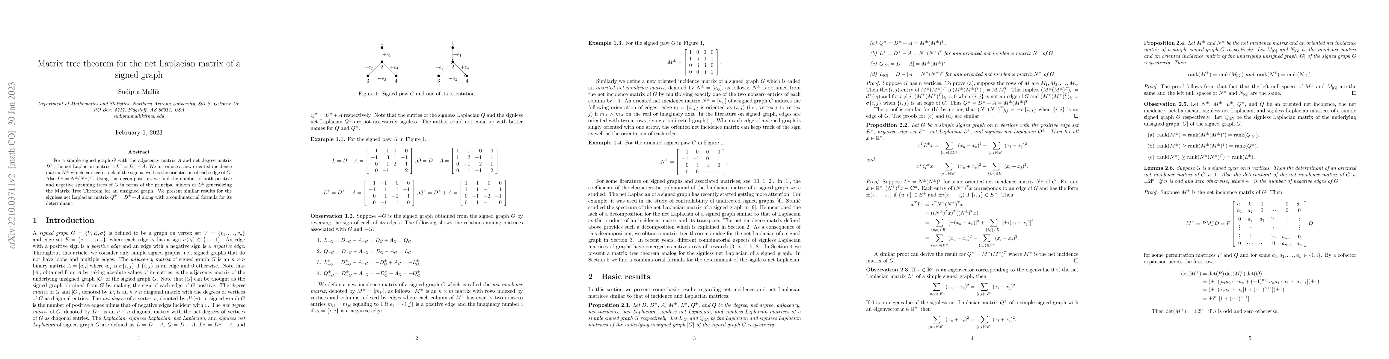 For a simple signed graph $G$ with the adjacency matrix $A$ and net degree matrix $D^{\pm}$, the net Laplacian matrix is $L^{\pm}=D^{\pm}-A$. We introduce a new oriented incidence matrix $N^{\pm}$ which can keep track of the sign as well as the orientation of each edge of $G$. Also $L^{\pm}=N^{\pm}(N^{\pm})^T$. Using this decomposition, we find the numbers of positive and negative spanning trees of $G$ in terms of the principal minors of $L^{\pm}$ generalizing Matrix Tree Theorem for an unsigned graph. We present similar results for the signless net Laplacian matrix $Q^{\pm}=D^{\pm}+A$ along with a combinatorial formula for its determinant.