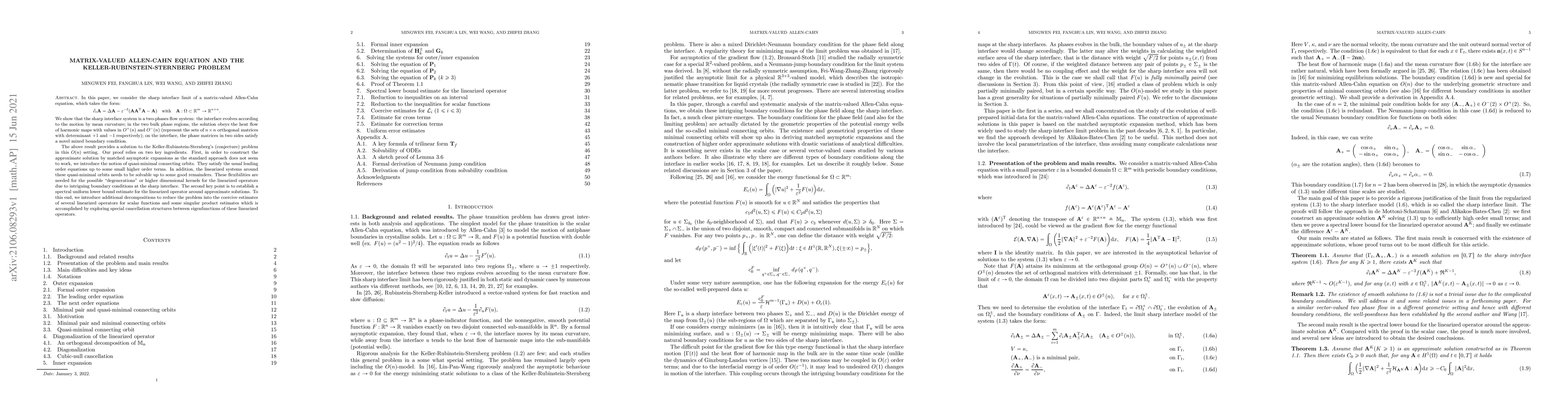 In this paper, we consider the sharp interface limit of a matrix-valued Allen-Cahn equation, which takes the form: $$\partial_t A=\Delta A-\varepsilon^{-2}( A A^{\mathrm{T}}A- A)~~\text{with}~~A:\Omega\subset\mathbb{R}^m\to\mathbb{R}^{n\times n}.$$ We show that the sharp interface system is a two-phases flow system: the interface evolves according to the motion by mean curvature; in the two bulk phase regions, the solution obeys the heat flow of harmonic maps with values in $O^+(n)$ and $O^-(n)$ (represent the sets of $n\times n$ orthogonal matrices with determinant $+1$ and $-1$ respectively); on the interface, the phase matrices in two sides satisfy a novel mixed boundary condition. The above result provides a solution to the Keller-Rubinstein-Sternberg's (conjecture) problem in this $O(n)$ setting. Our proof relies on two key ingredients. First, in order to construct the approximate solution by matched asymptotic expansions as the standard approach does not seem to work, we introduce the notion of quasi-minimal connecting orbits. They satisfy the usual leading order equations up to some small higher order terms. In addition, the linearized systems around these quasi-minimal orbits needs to be solvable up to some good remainders. These flexibilities are needed for the possible "degenerations" or higher dimensional kernels for the linearized operators due to intriguing boundary conditions at the sharp interface. The second key point is to establish a spectral uniform lower bound estimate for the linearized operator around approximate solutions. To this end, we introduce additional decompositions to reduce the problem into the coercive estimates of several linearized operators for scalar functions and some singular product estimates which is accomplished by exploring special cancellation structures between eigenfunctions of these linearized operators.