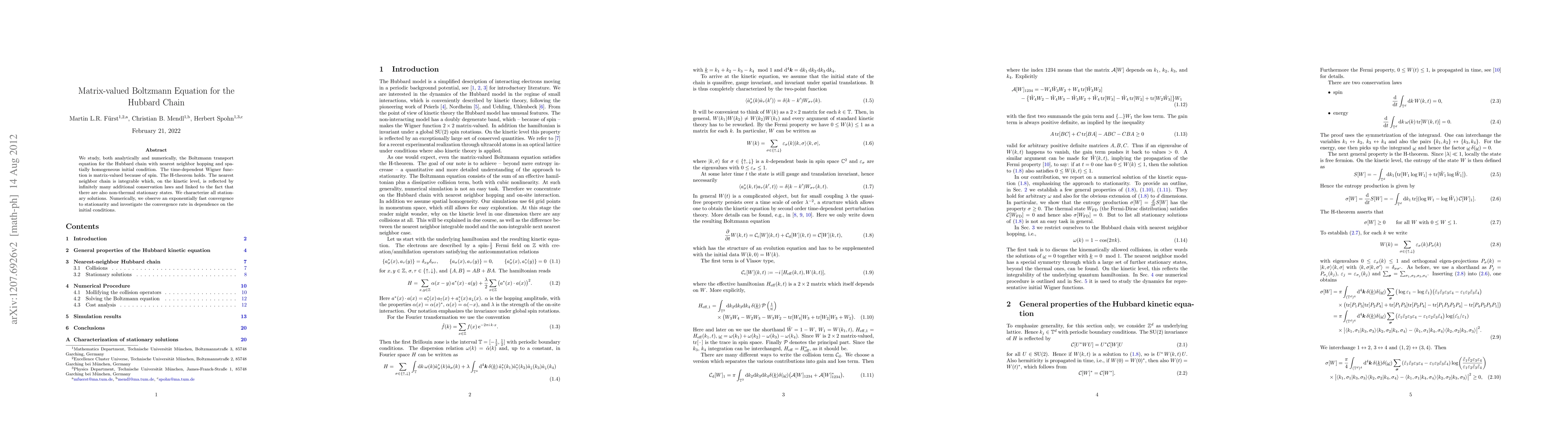 This research explores the matrix-valued Boltzmann transport equation for the Hubbard chain, confirming the H-theorem's validity. It identifies all stationary solutions, observing exponential convergence to stationarity numerically, with convergence rates dependent on initial conditions. The integrable nearest-neighbor chain exhibits infinitely many conservation laws and non-thermal stationary states.