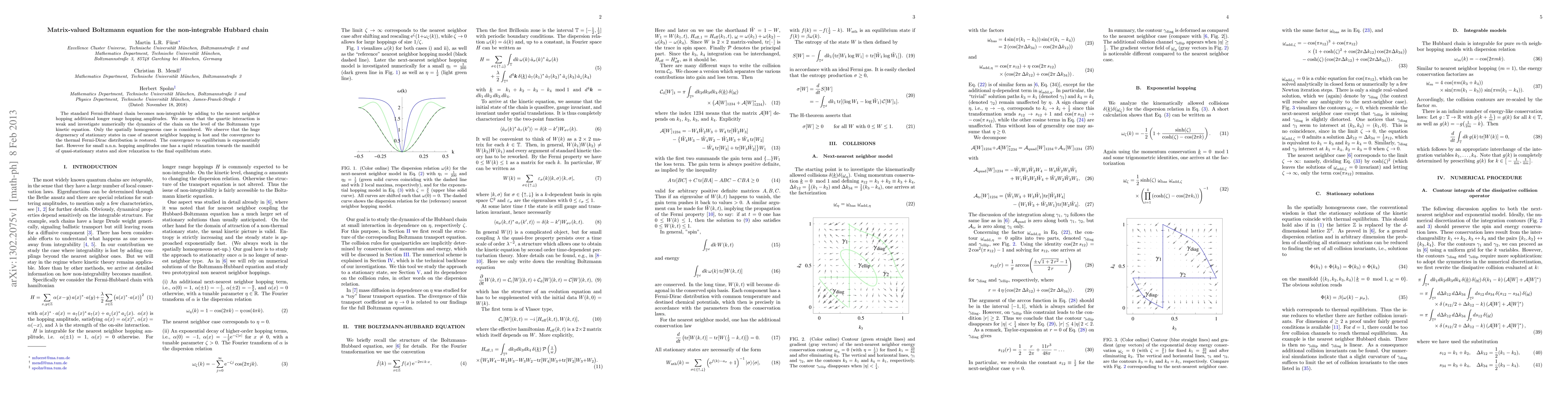 The standard Fermi-Hubbard chain becomes non-integrable by adding to the nearest neighbor hopping additional longer range hopping amplitudes. We assume that the quartic interaction is weak and investigate numerically the dynamics of the chain on the level of the Boltzmann type kinetic equation. Only the spatially homogeneous case is considered. We observe that the huge degeneracy of stationary states in case of nearest neighbor hopping is lost and the convergence to the thermal Fermi-Dirac distribution is restored. The convergence to equilibrium is exponentially fast. However for small n.n.n. hopping amplitudes one has a rapid relaxation towards the manifold of quasi-stationary states and slow relaxation to the final equilibrium state.
